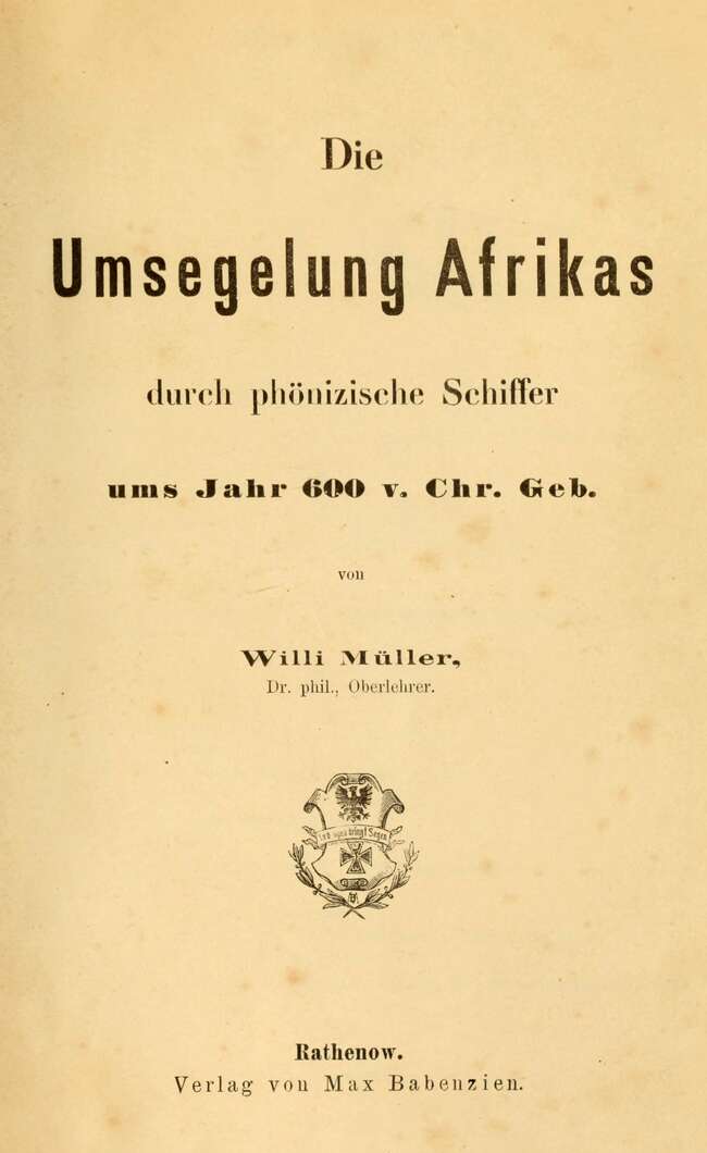 Herodot erzählt im 42. Kapitel des IV. Buches seines Geschichtswerkes Folgendes: „Es ist klar, dass Libyen vom Meere umflossen ist mit Ausnahme des Theiles, der an Asien grenzt, und dies hat Necho, der König von Aegypten, soweit wir wissen, zuerst bewiesen. Als dieser nämlich die Arbeiten an dem Kanale einstellen liess, der aus dem Nile in den arabischen Busen führen sollte, sandte er phönizische Männer zu Schiffe ab mit dem Befehl, auf der Heimreise durch die Säulen des Herakles zu fahren und so über das nördliche Meer nach Aegypten zurückzukehren. Die Phönizier segelten demgemäss aus dem rothen Meere ab und fuhren in das Südmeer. So oft die Saatzeit kam, landeten sie, bestellten das Feld, wo sie gerade in Libyen waren und warteten die Ernte ab. Wenn sie aber das Korn eingeheimst hatten, fuhren sie weiter, bogen nach Verlauf von zwei Jahren im dritten durch die Säulen des Herakles und gelangten nach Aegypten. Sie erzählten aber – was mir zwar nicht glaublich ist, vielleicht aber einem andern – dass sie bei ihrer Fahrt um Libyen die Sonne zur Rechten gehabt“[4].