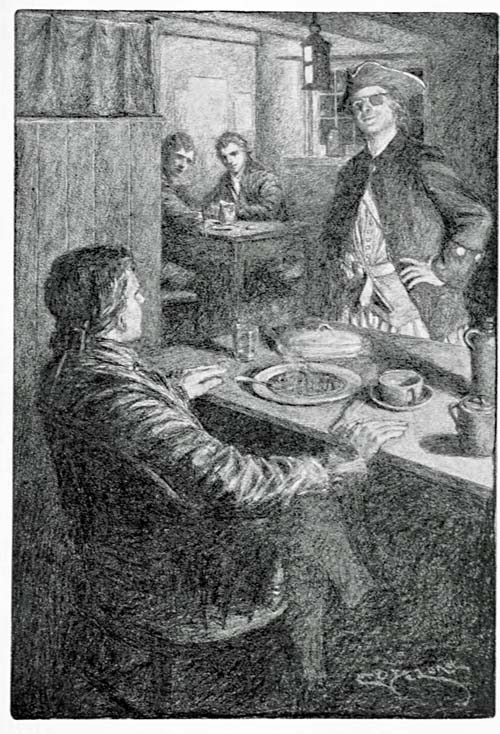 So interested were all the boys in the talk, which now became general, that they did not notice a horseman ride up, dismount and tie his nag to a post near at hand. He was a tall, spare, raw-boned man, with fiery red hair. He held himself with the rigid bearing of a man trained in the army; his face was resolute, indeed fierce looking; and an ugly sword slash had left a red scar across it that did not add to his appearance. He stood at his horse’s head listening, as Philip Morgan went on, addressing Danvers.