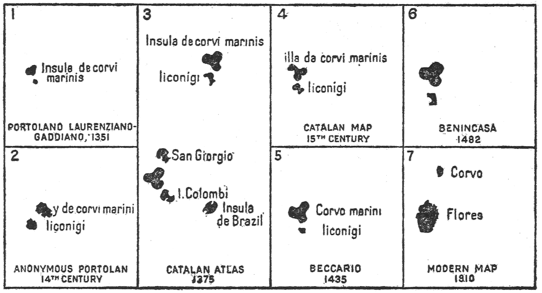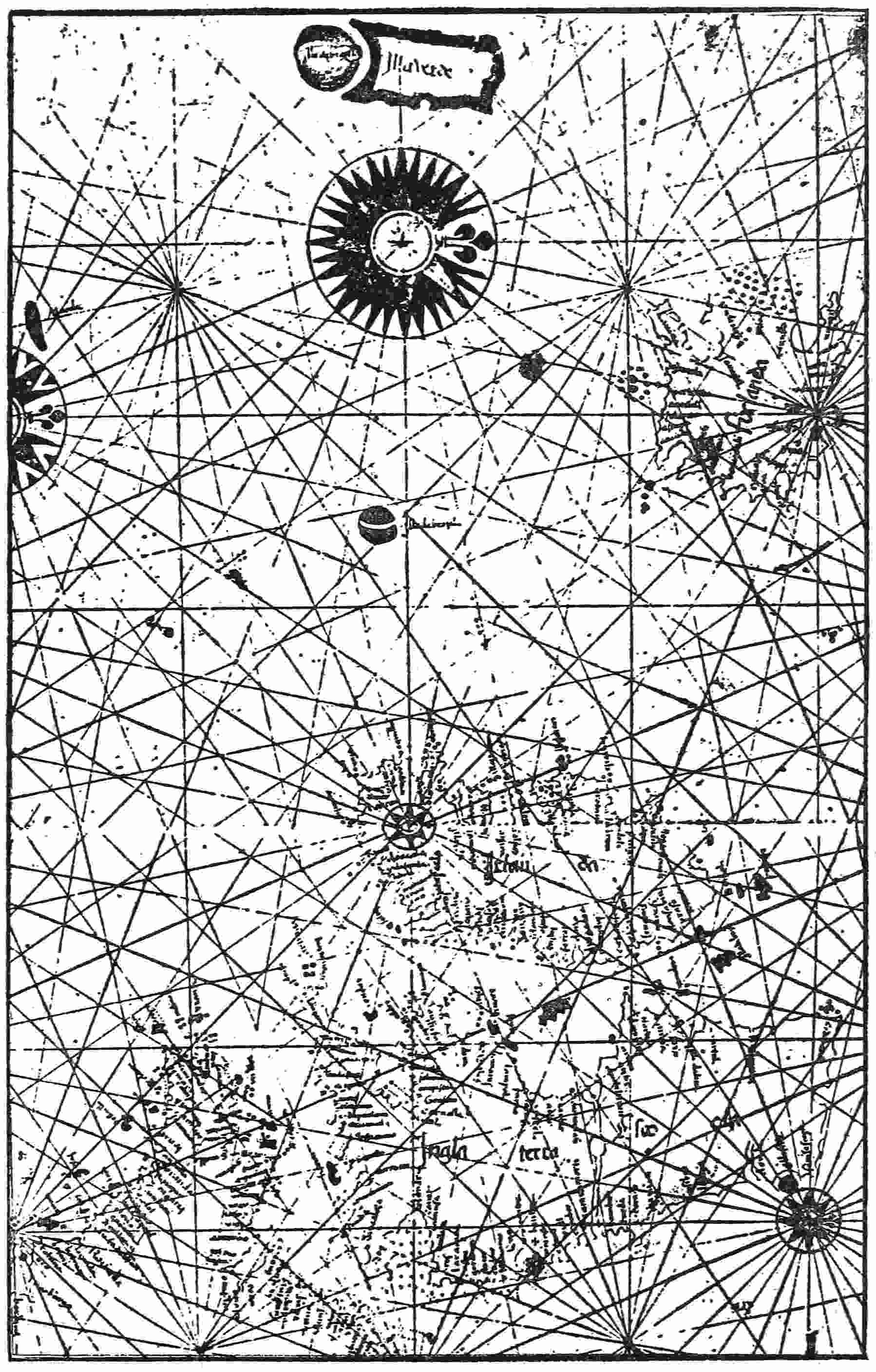 The Italians of the thirteenth century undertook similar explorations and temporarily occupied at least one of the Canary Islands, Lanzarote, which still bears, corrupted, the name of its Genoese invader, Lancelota Maloessel, of about 1470. On early fourteenth-century maps and some later ones the cross of Genoa is conspicuously marked on this island in commemoration of the exploit. It was probably at this period that Italian names were applied to most of the Azores and to other islands of the eastern groups. A few of these names still persist, for example, Porto Santo and Corvo; but others, after the rediscovery, gave way to Portuguese equivalents or substitutes. Thus Legname was translated into Madeira, and Li Conigi (Rabbit Island) became more prettily Flores (Island of Flowers). About 1285 the Genoese also sent out an expedition9 “to seek the east by way of the west” under the brothers Vivaldi, who promptly vanished with all their men. Long afterward another expedition picked up on the African coast one who claimed to be a survivor; and it is probable that the Genoese expedition attempted to sail around Africa but came upon disaster before it was far on its way. The thirteenth- and fourteenth-century Italians undoubtedly added many islands to the maps or secured their places there; but we have no evidence that they passed westward beyond the middle of the Atlantic.