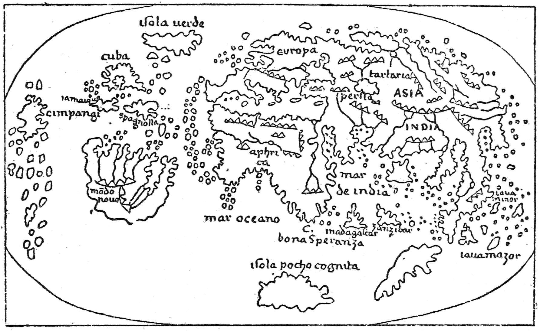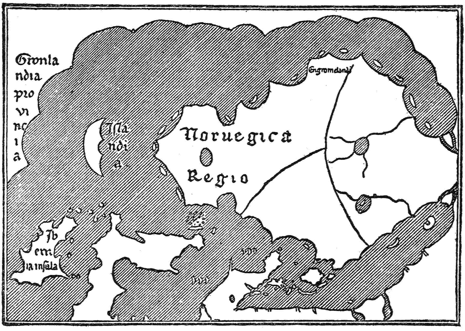 Less than a quarter of a century after their first landing the Norse Greenlanders became aware of a more temperate coast line to the southwest, the better part of which they called Vinland, or Wineland, but all of which we now name America. Perhaps Leif Ericsson brought the first report of it as the result of an accidental landfall close to the year 1000 A. D. Not long afterward, Thorfinn Karlsefni with three ships and 160 people attempted to colonize a part of the region. The venture failed, owing chiefly to the hostility of the Indians at the most favorable point. The visitors, however, made the acquaintance of the typical American Atlantic shore line of beach and sand dune which stretches from Cape Cod to the tip of Florida with one or two slight interruptions and one or two fragmentary minor northward extensions. The Norsemen or some predecessor had observed and named the three great zones of territory which must always have existed. Among investigators there has been general concurrence as to their discovery of Labrador and Newfoundland, to which most would add Cape Breton Island and more or less of the coast beyond. It has appeared to me that they made their chief abode in the New World on the shore of Passamaquoddy Bay behind Grand Manan Island and Grand Manan Channel, with the racing ocean streams of the mouth of the Bay of Fundy; and that they found this site inclement in winter and tried to remove to a land-locked bay of southern New England but were baffled and withdrew. My reasons have been pretty fully set forth in “Early Norse Visits to North America.”7 For the present it is enough to say that the discovered regions seem sometimes to have been thought of as a continuous coast line, sometimes as separate islands more or less at sea. But they did not get upon the maps in any shape until several centuries later.