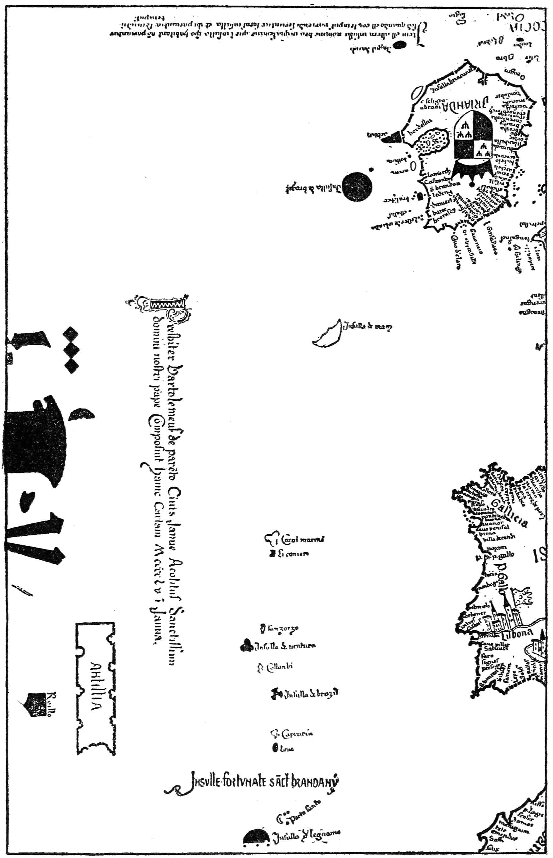 Ireland was never subject to Rome, though influenced by Roman trade and culture. From prehistoric times the Irish had done some sea roving, as their Imrama, or sea sagas, attest; and this roving was greatly stimulated in the first few centuries of conversion to Christianity by an abounding access of religious zeal. Irish monks seem to have settled in Iceland before the end of the eighth century and even to have sailed well beyond it. There are good reasons for believing that they had visited most of the islands of the eastern Atlantic archipelagoes. We cannot suppose that this rather reckless persistency ended there in such a period of expansion. It is quite possible that we owe to this trait the Island of Brazil, in the latitude of southern Ireland, as an American souvenir on so many medieval maps (Ch. IV). It is certain that the “Navigatio” of St. Brendan scattered St. Brandan Islands, real or fanciful, over the ocean wastes of a credulous cartography (Ch. III).
