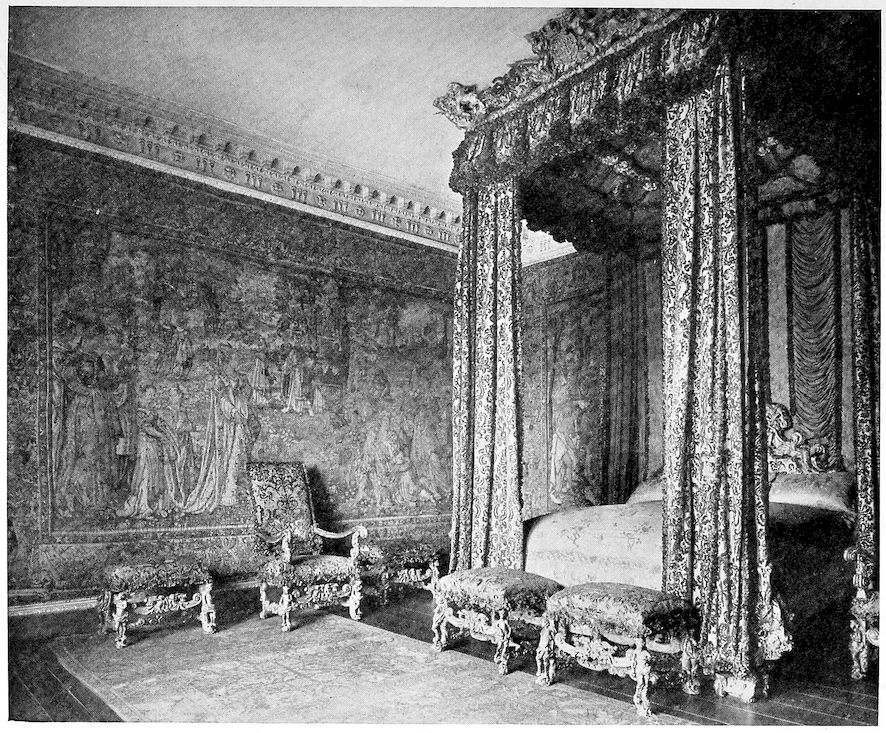 It is almost a relief to go from here to the Venetian Ambassador’s Bedroom. Green and gold; Burgundian 16tapestry, mediaeval figures walking in a garden; a rosy Persian rug—of all rooms I never saw a room that so had over it a bloom like the bloom on a bowl of grapes and figs. I cannot keep the simile, which may convey nothing to those who have not seen the room, out of my mind. Greens and pinks originally bright, now dusted and tarnished over. It is a very grave, stately room, rather melancholy in spite of its stateliness. It seems to miss its inhabitants more than do any of the other rooms. Perhaps this is because the bed appears to be designed for three: it is of enormous breadth, and there are three pillows in a row. Presumably this is what the Italians call a letto matrimoniale.