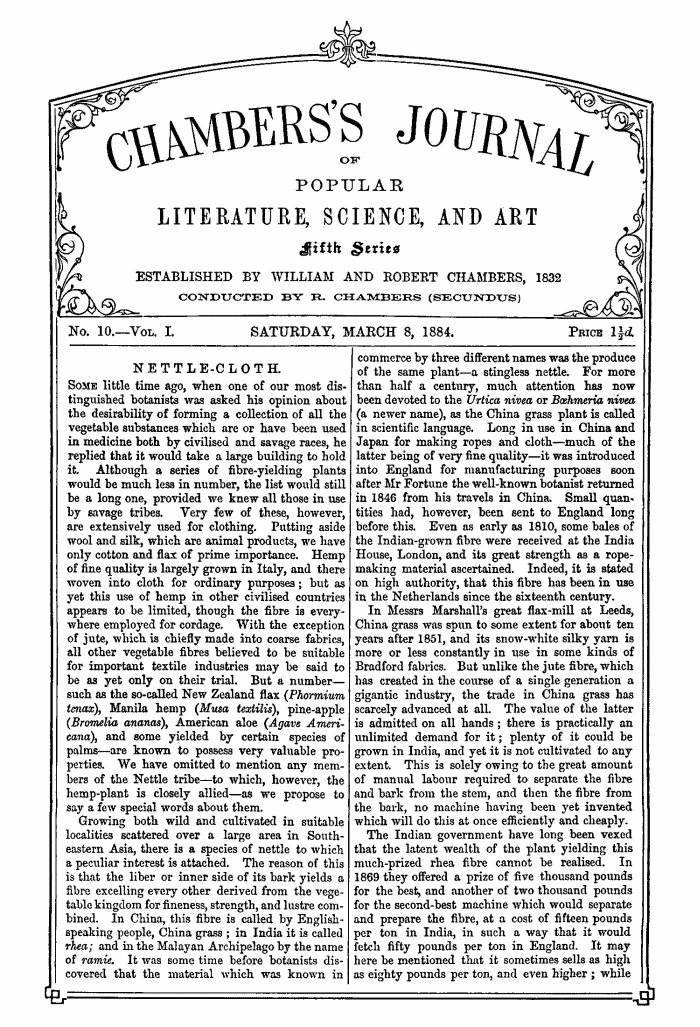 Growing both wild and cultivated in suitable localities scattered over a large area in South-eastern Asia, there is a species of nettle to which a peculiar interest is attached. The reason of this is that the liber or inner side of its bark yields a fibre excelling every other derived from the vegetable kingdom for fineness, strength, and lustre combined. In China, this fibre is called by English-speaking people, China grass; in India it is called rhea; and in the Malayan Archipelago by the name of ramie. It was some time before botanists discovered that the material which was known in commerce by three different names was the produce of the same plant—a stingless nettle. For more than half a century, much attention has now been devoted to the Urtica nivea or Bœhmeria nivea (a newer name), as the China grass plant is called in scientific language. Long in use in China and Japan for making ropes and cloth—much of the latter being of very fine quality—it was introduced into England for manufacturing purposes soon after Mr Fortune the well-known botanist returned in 1846 from his travels in China. Small quantities had, however, been sent to England long before this. Even as early as 1810, some bales of the Indian-grown fibre were received at the India House, London, and its great strength as a rope-making material ascertained. Indeed, it is stated on high authority, that this fibre has been in use in the Netherlands since the sixteenth century.