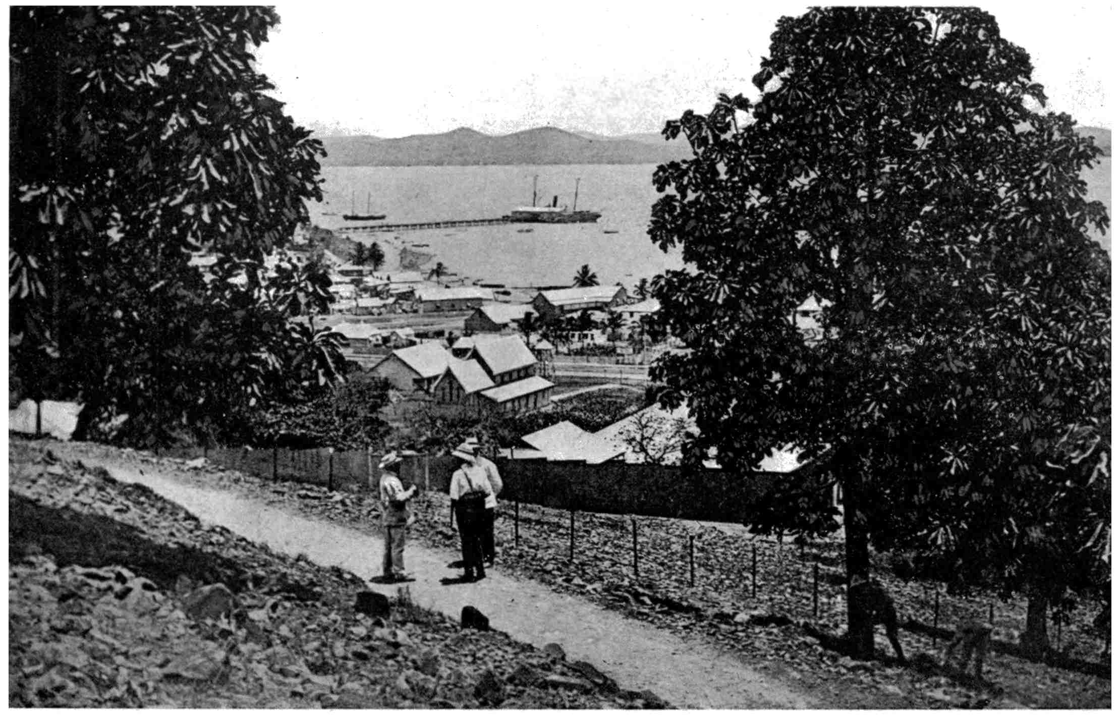 The pleasant evening slipped away too soon. It was time to return to the port. We strolled back through the mysterious night, moist and warm and scented by flowering frangipani in the gardens of the dimly seen bungalows. Our boat lying below in the harbour was a blazing patch of light; the glow of a distant bush fire lit up the opposite coast; and that was all—all that we saw of the Northern Territory, mysterious fascinating, and beautiful, with its vast and intricate problems of labour and climate waiting solution. For with early morning we slipped away from its red and green shores, just as the rising sun had crimsoned all the glassy sea. That292 is our last memory of Australia, and of all the places we visited it was Port Darwin that we were most loth to leave, for we somehow felt that Australia had kept her best till last.