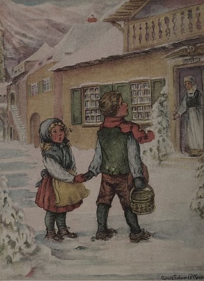When they reached Altdorf, they[10] found many children singing carols before the houses, so they went on till they came to the great inn, near an old tower. The mother stationed the children by the door while she stood behind the tower. Soon the door opened and the children were called into the large guest-room. The people praised the song, and many pieces of bread and cheese and small coins found their way into the basket Barty carried on his arm. The landlady put in some nuts, saying, “One must have something besides bread on New Year’s Day.”