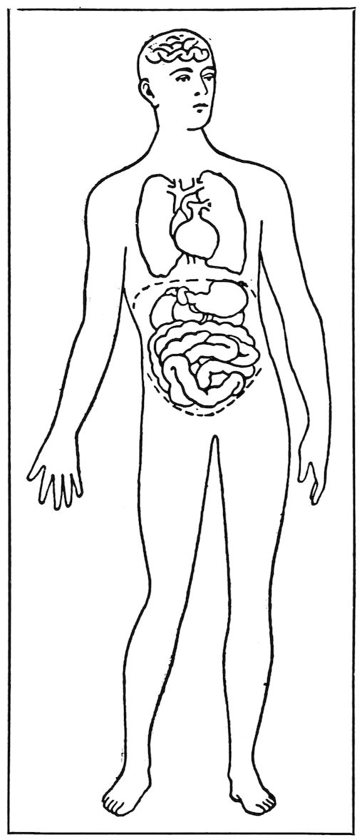 The third box, which we call the abdominal cavity, is separated from the chest by a broad, thin muscle, the diaphragm. The abdomen has a hard floor of bone, but the walls are soft, being made up only of the muscles and the lower ribs. In the abdomen are the stomach and intestines, the liver, 13kidneys, and other organs of which we shall learn later.