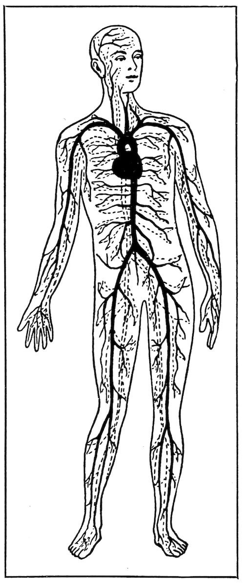 The blood is forced by the heart through the arteries (black lines), and returns to it through the veins (dotted lines).