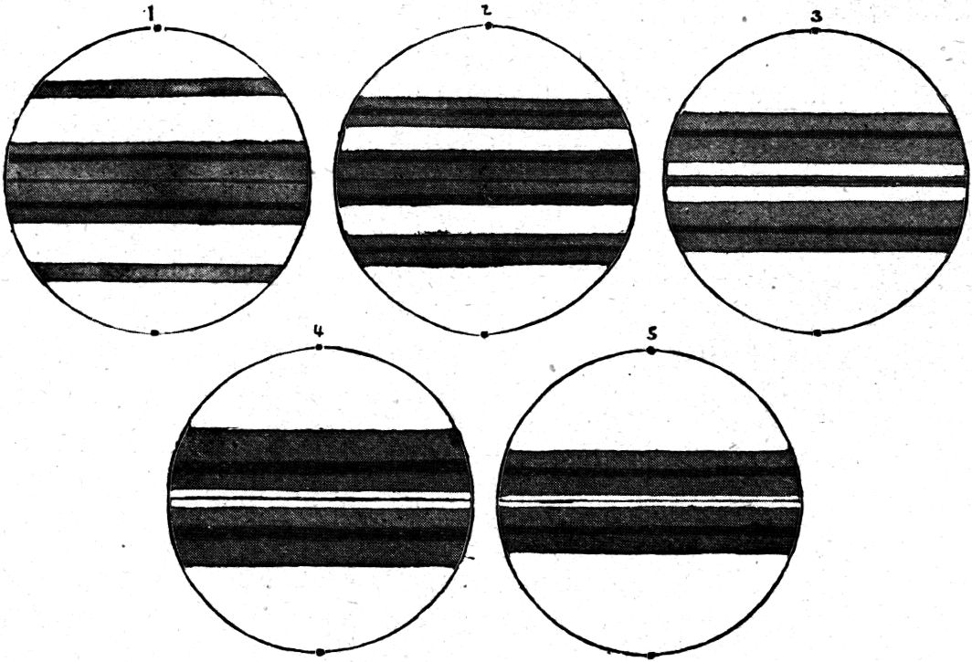 Parallel mit diesen Schwankungen der Sonnentätigkeit geht nun auch die eigentümliche Verteilung der Flecke über die Oberfläche des glühenden Balles. Da sich dieser, worauf wir noch näher zurückkommen, um seine Achse dreht, so kann man auf ihm geometrisch einen Äquator, Breiten- und Längengrade unterscheiden, wie auf der Erde, und also auch in bezug auf diese das Fleckenphänomen studieren. Es fand sich dabei, daß Flecke nur in einer äquatorialen Zone häufig auftreten; schon jenseits einer Breite von 33 Grad nördlich und südlich sind Flecke sehr selten, über 42 Grad werden keine mehr beobachtet. Die den Polen näher kommenden Flecke scheinen besonderen Umständen ihre Existenz zu verdanken, da sie von dem Verlauf der oben erwähnten Periode mehr oder weniger unabhängig sind. Aber auch wieder auf dem Äquator selbst und in seiner nächsten Umgebung sind die Flecke seltener. Nach Beobachtungen in Greenwich, die sich über die Jahre 1874 bis 1902 erstrecken, verläuft nun das Fleckenphänomen folgendermaßen: Das Bild auf Seite 27 veranschaulicht diese Verhältnisse. Während der Zeit des Minimums zeigen sich Flecke in einer Zone, die nicht über 18 Grad Breite zu beiden Seiten reicht. Der Beginn der neuen Tätigkeit kündigt sich dann durch das Auftreten von Flecken in höheren Breiten bei etwa 30 Grad an, so daß zwischen dieser Zone und dem äquatorialen Gürtel ein fast fleckenfreier Raum vorhanden ist. Die neu beginnende Tätigkeit steht also in keinem direkten Zusammenhange mit der alten, die sich auf jenen Äquatorgürtel zurückgezogen[27] hatte. Die Zone der größten Fleckenhäufigkeit rückt nun aber in immer niederere Breiten, bis sich schließlich die neue Zone mit der alten vereinigt, so daß das Maximum der Sonnentätigkeit etwa auf 15 Grad Breite fällt. So wiederholt sich das Spiel regelmäßig. Aber überall zeigen sich auch wieder Abweichungen, so daß man zur Aufstellung eines festen Gesetzes nicht gelangen kann. Auch auf beiden Hemisphären der Sonne scheint die Fleckenfrequenz ungleich zu sein. Während der vorhin angegebenen Beobachtungsperiode war die südliche Halbkugel »fruchtbarer« als die nördliche. In bezug auf die Verteilung nach den Längengraden scheinen gleichfalls gewisse Gegenden, ja bestimmte Punkte für die Fleckenbildung begünstigt zu sein. Dieser Umstand ist sehr beachtenswert, da er darauf hindeutet, daß im Innern der Sonne doch schon irgendwie festere Regionen vorhanden sein müssen, welche allein nur die Ursachen von Störungen sein können, die eben immer wieder an diesen selben Punkten auftreten.