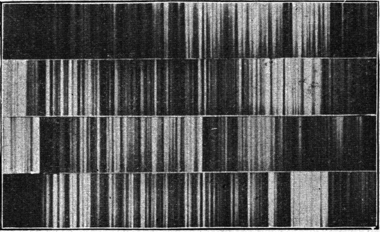 Selbstverständlich richtete man sofort das Spektroskop auf das so plötzlich aufgetretene neue Himmelswesen. Es zeigte sich in den Linien seines Spektrums, daß hier zwei verschiedene Massen mit ganz furchtbarer Gewalt aufeinandergestoßen waren, die eine davon mit einer Geschwindigkeit von beinahe tausend Kilometern in der Sekunde. Dadurch mußten die Körper offenbar zum großen Teil zertrümmert[76] und eine ganz ungeheure Hitze entwickelt werden. Die glühenden Gase der Umgebung gaben leuchtende Linien.