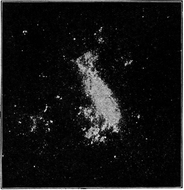 Ist das Milchstraßen-Universum wirklich eine Spirale, so muß[93] eine andere Masse, die von jenseits desselben herüber gekommen ist, die kreisende Bewegung durch einen Zusammenstoß hervorgebracht haben. Es muß sich also auch jenseits der Grenzen unserer direkten Erkenntnis noch etwas befinden, und unser Universum muß doch wieder nur ein Teil eines noch weit größeren sein, das sich unsern Sinnen vielleicht ewig entzieht, in dem aber der für uns alles umfassende Spiralnebel der Milchstraße abermals nur einer unter vielen ist. Es scheint sogar, als ob wir jene andere Masse, die durch ihren Zusammenstoß den Werdeprozeß dieses unseres Weltgebäudes und damit alle unsere Geschicke einleitete, diese Masse, die das Weltall einst befruchtete, heute noch am Himmel sehen könnten. Nicht weit vom Zuge der Milchstraße auf der südlichen Himmelshälfte erkennt man zwei von ihr losgelöste leuchtende Massen, die Magellanischen Wolken, von denen die größere nach einer Originalaufnahme des Harvard College-Observatoriums hier abgebildet ist. Sie sind durchaus zu vergleichen mit den Nebelknoten, die wir in der Nähe gewisser Spiralnebel wahrnahmen, und die ganz so aussehen, als ob sie ihre wirbelnde Bewegung verursacht hätten. Vielleicht also ist diese himmlische Wolke hier der Vater alles Gewordenen. Denn all unsere Lose lagen verteilt in jener Urmasse, und allem wurde die Entwicklungsrichtung gegeben durch jenen ersten weltenbildenden Zusammenstoß.