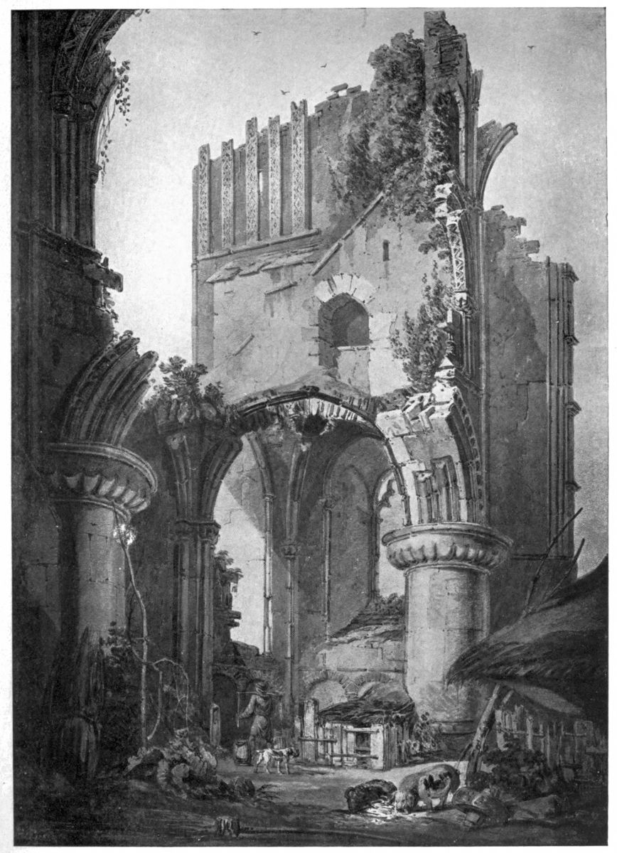 Though a year later in execution than the Evesham drawings, this was based on sketches which had been made in 1791. These are now in the National Gallery (Turner Bequest, VII C. and D.) One is inscribed in Turner’s handwriting, “The Ruins of the Tower at the West End of Malmesbury Abbey, taken from the Friars Walk, 1791.” It is carefully worked in water-colour with brown ink outlines. The other drawing is similarly worked and represents the same tower from a point of view a little more to the left and lower down. The picturesque features of these two views have been cunningly combined in the finished drawing.{5}