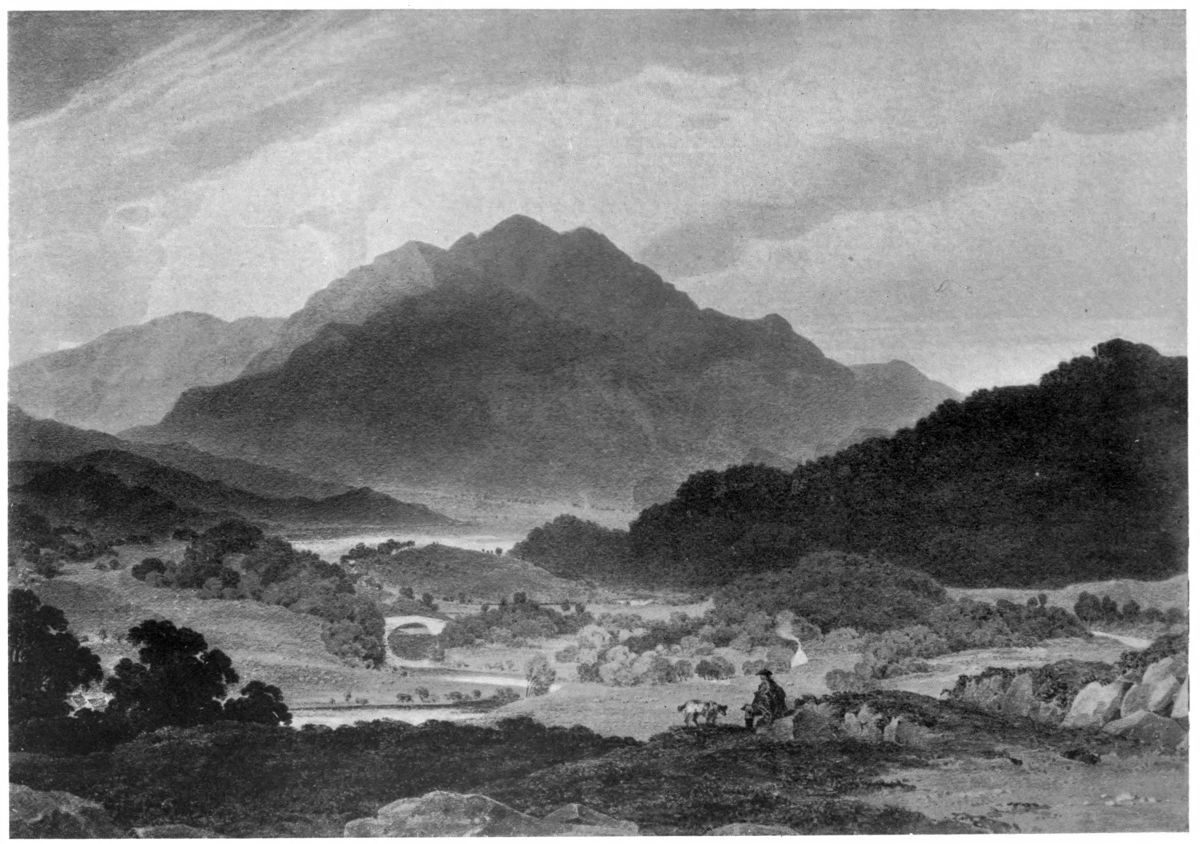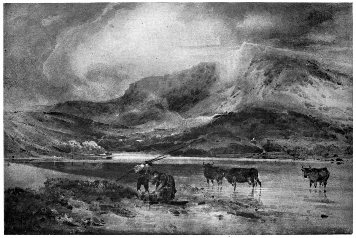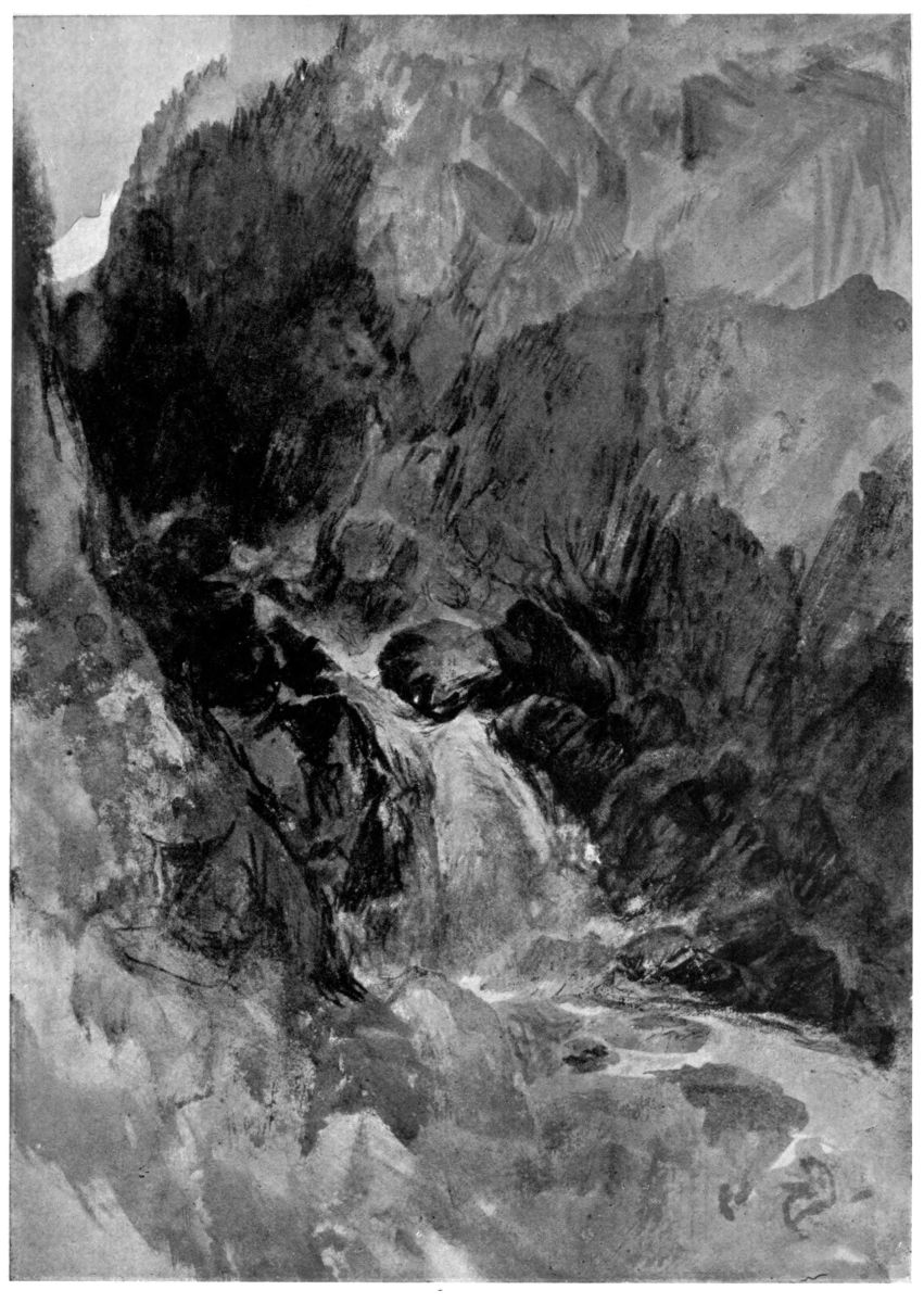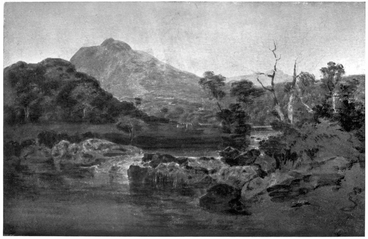 In A Mountain Stream (Plate IV) Turner has got completely away from his early “bit-by-bit” manner of working. The scene is grasped as a whole, and every detail and part is subordinated to the general effect. This is a fine example of the early development of Turner’s executive mastery. Every touch is inspired by the general conception.