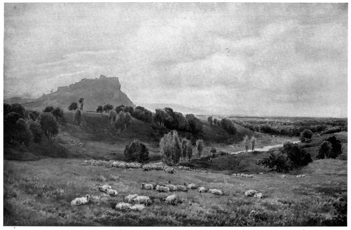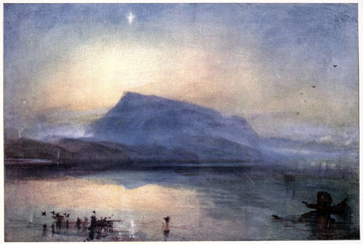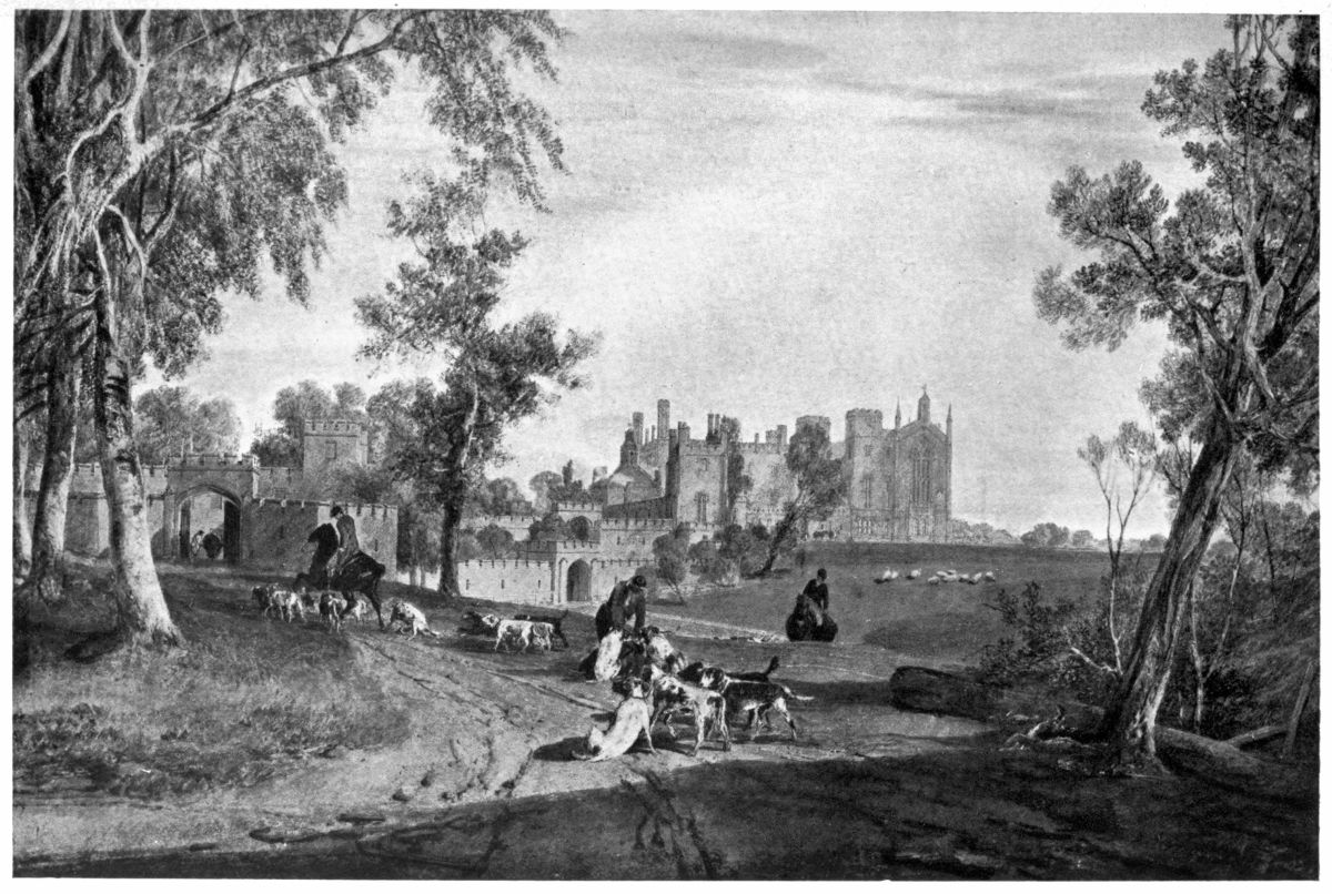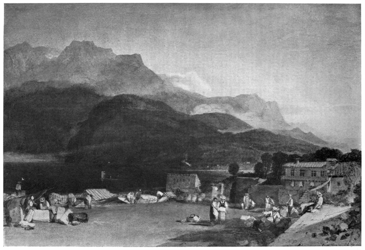 I have said that this exhibition was neither superior nor inferior to its immediate predecessors, but to say that it was not inferior was to give it very high praise. The exhibition, indeed, was one which would have done{2} credit to any of our public galleries. The array of Turner’s masterpieces on the long south wall of the gallery produced an overpowering sense of his incomparable technical skill, his boundless energy, and the infinite variety of his mind. In the centre of the wall, in a place of honour, was enthroned the regal Lake Nemi (Plate XV), resplendent with something brighter than the sunshine of Italy, a gorgeous and intoxicating dream of sensuous beauty. Beneath it hung the awe-inspiring Longships Lighthouse (Plate XIII), and on the right the beautiful and pathetic “Blue Rigi” (Plate XVII), tender and wistful, in which the helplessness and restlessness of old age only made more manifest the sorrows and regrets with which the painter’s heart was filled. Grouped round these great masterpieces of his full strength and waning powers were works of his early manhood, like the Cassiobury (Plate V), with its horses and dogs, a robust jovial scene, the Lake of Thun (Plate VI), the restrained and elegant Castle of Chillon (Plate VII), the dainty, coquettish Scarborough, several of the Rhine drawings of 1817, and many of his proudest and most exultant drawings, like the Byronic Florence, from near San Miniato (Plate XVI), the Saumur (Plate X), and the Saltash (Plate XXI), Prudhoe (Plate XXII), Richmond Bridge (Plate XI), Windsor Castle, Coventry, and the somewhat operatic Worcester (Plate XII), of the “England and Wales” series; nor must I forget the impressive Lowestoft, a grey and gloomy tragedy as grim and moving even as the Longships.