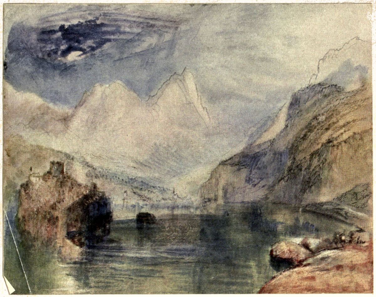 As Turner’s drawings formed the chief feature of the exhibition I will begin my comments with them. The best way to arrange my notes seems to be to take the drawings in their chronological order, disregarding the sequence in which they were hung in the exhibition. By beginning in this way, with the earlier drawings, we shall be able to study the gradual development of Turner’s mind and skill.