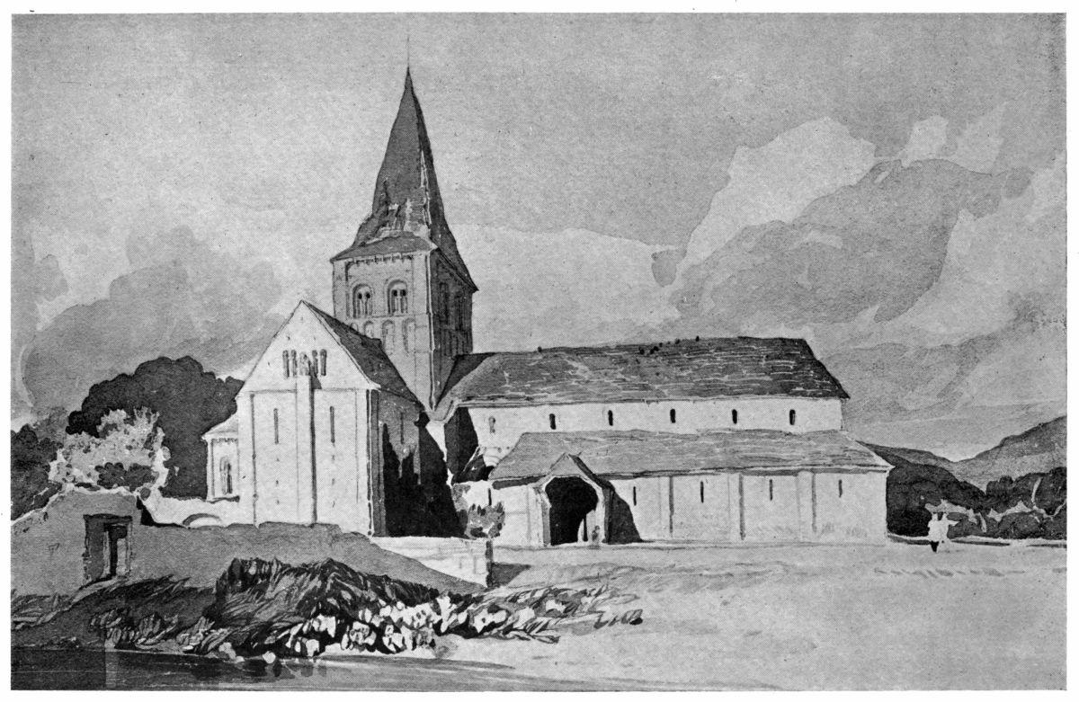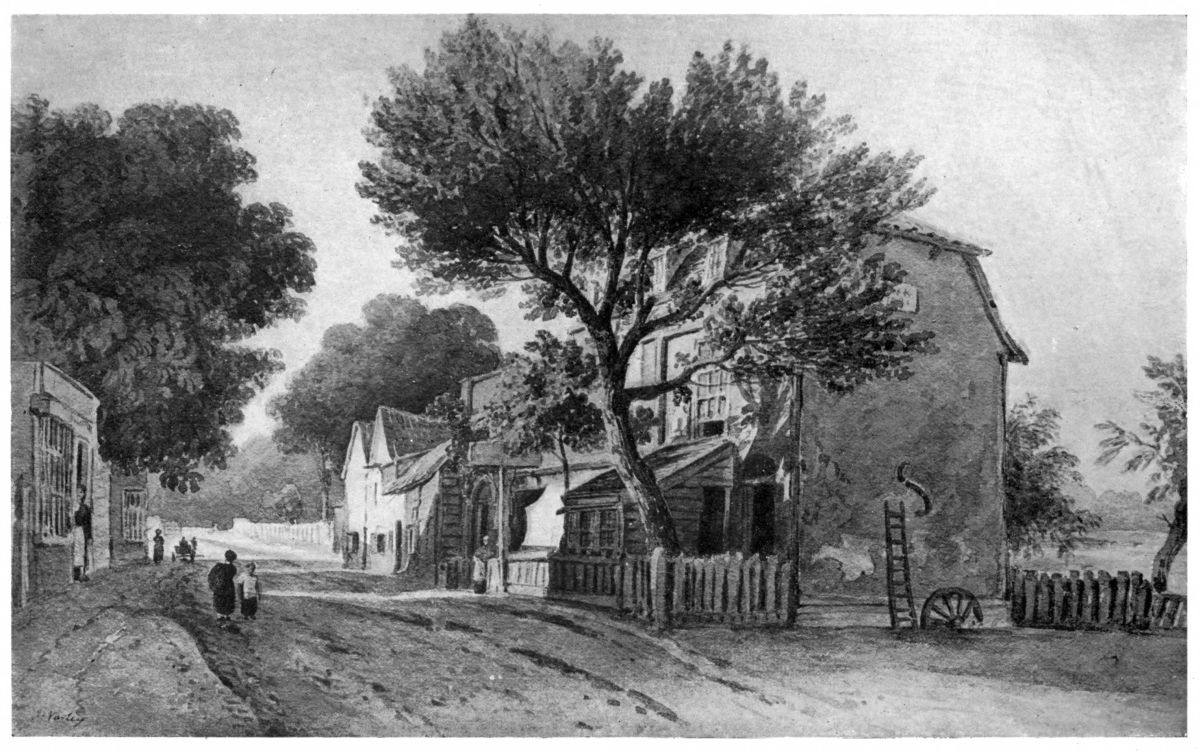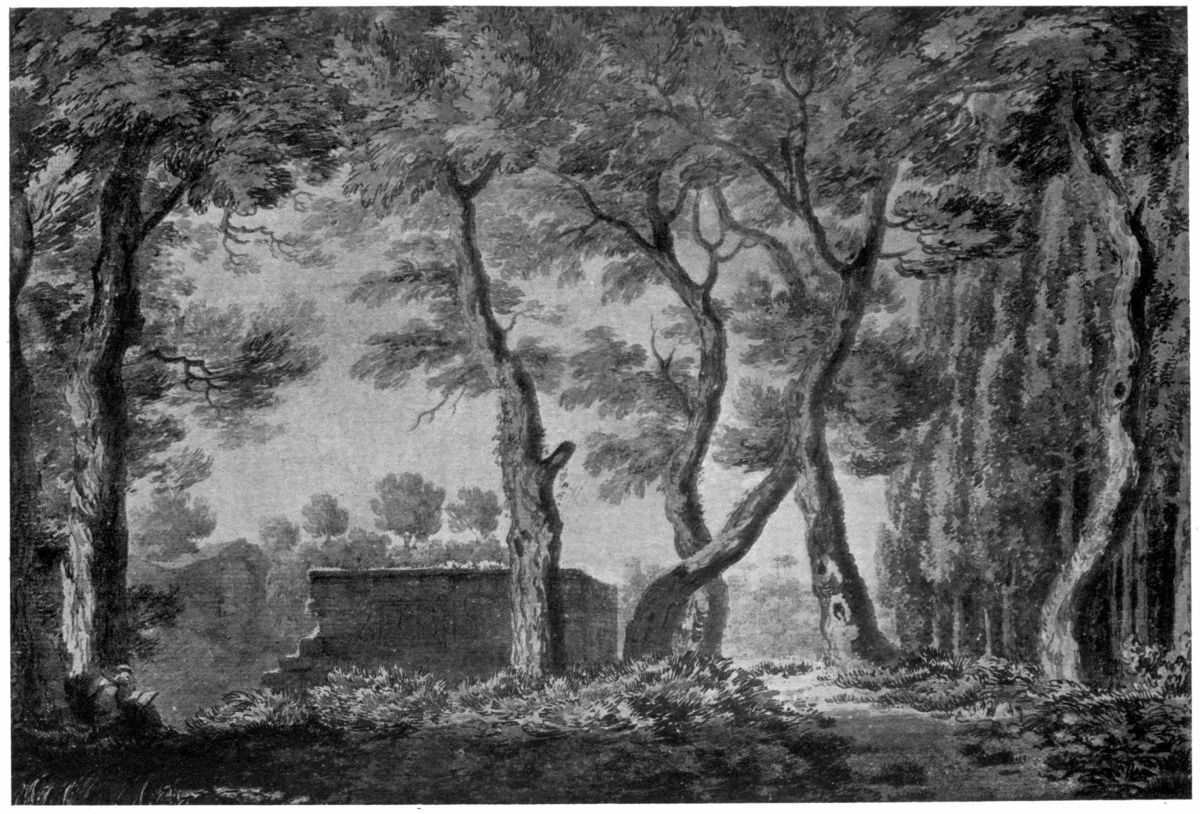 And as no man stands alone—not even the greatest of geniuses—the educational value of this array of masterpieces was increased by a fine display of the works of those English water-colour painters who had been born and had worked before Turner, and of his contemporaries. The early topographical draughtsmen whom Turner first set out to imitate and rival, were represented by Paul Sandby’s The Swan Inn, Edmonton (Plate XXV), Thomas Hearne’s Thaxted Church, Essex, Thomas Malton Junior’s two quaint views of Bath, and many other drawings, mostly in the “stained” manner, by Wheatley, J. I. Richards, Ibbetson, William Payne, Dayes and others. Richard Wilson, the chief influence in directing Turner’s genius to imaginative design, was perforce unrepresented, as he does not seem to have worked in water-colour; but Gainsborough was represented by one of his charming drawings in chalk, and there was a noble group of nine of John R. Cozens’s austerely beautiful drawings, among them the large Lake Albano, and the charming Villa Negroni (Plate XXIX). Turner’s contemporaries were well represented by over seventy drawings, which included three of his friend Girtin’s early works, and at least one fine example of his robust maturity—a masterly view of the ruined Lady Chapel of Fountains Abbey. Cotman had two fine early Girtinesque drawings, Gormire Lake, Yorkshire (Plate XXXIV), and Bridge over River (Plate XXXIII), a nobly designed Lake Scene (Plate XXXVI), in monochrome, and a brilliantly{3} coloured view of Rouen (Plate XXXV). There were also two of Copley Fielding’s most ambitious sea-pieces—The Pilot Boat (Plate XLII) and Seaford from Newhaven Pier, and a number of admirable drawings by De Wint, David Cox, Varley and Prout.