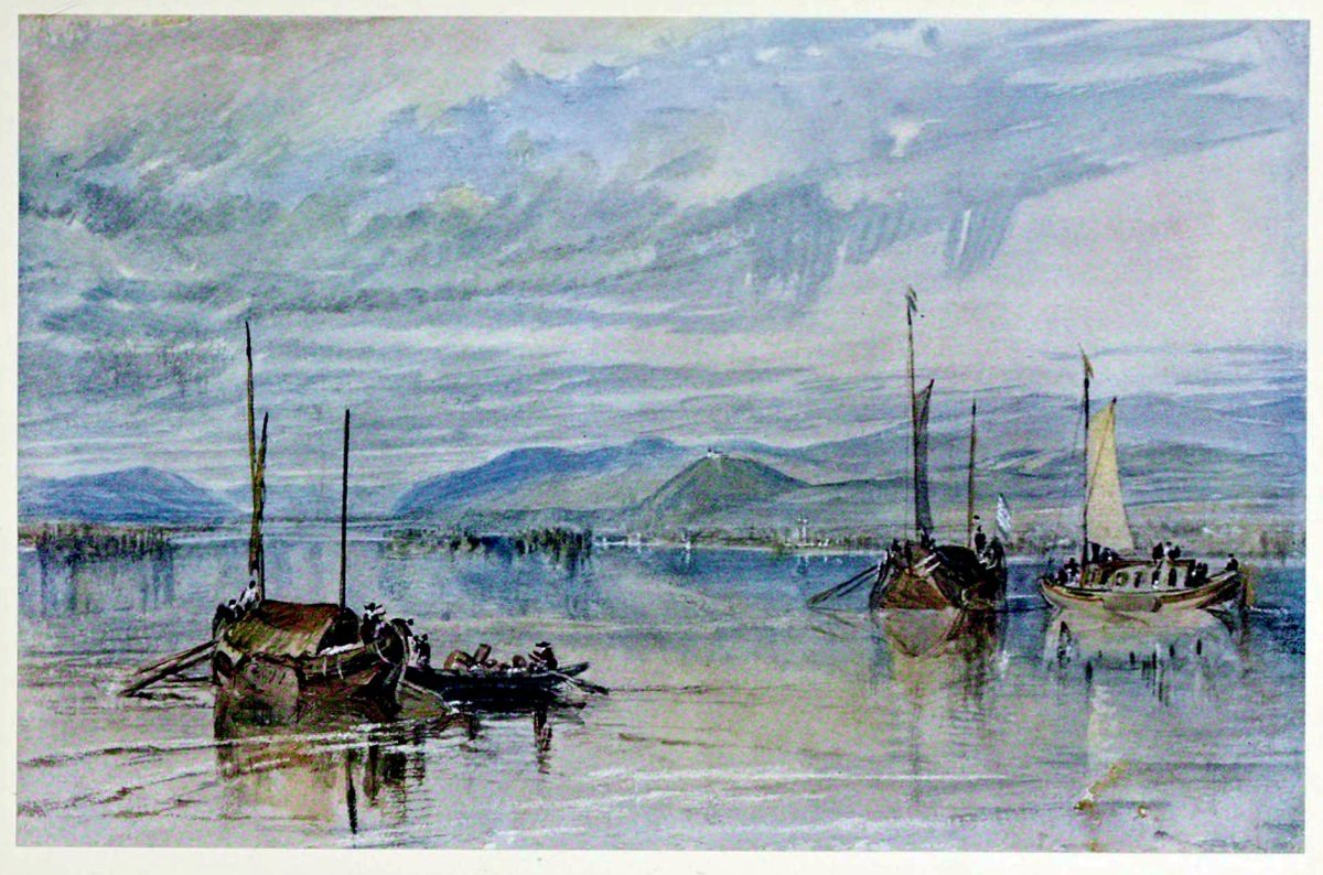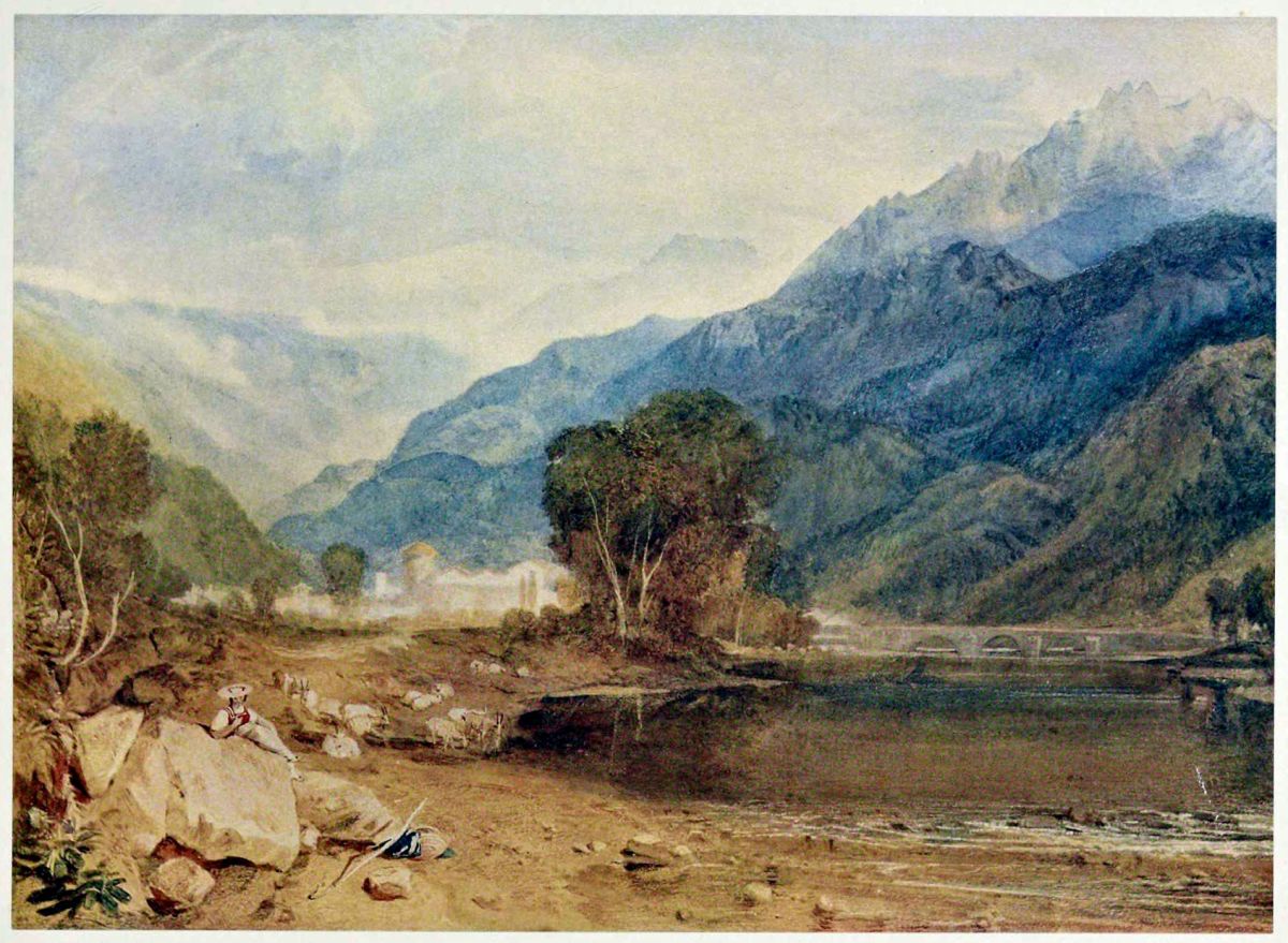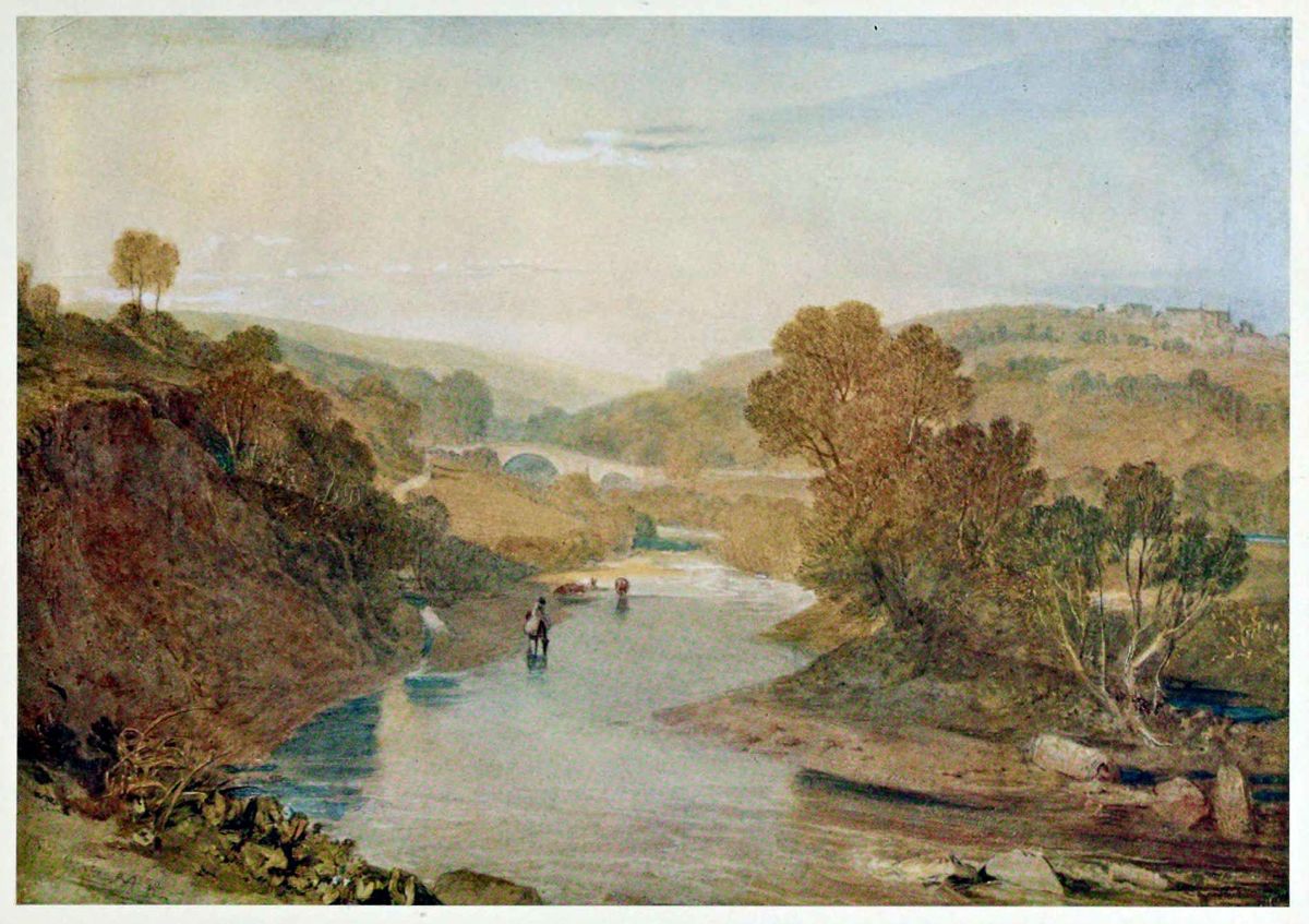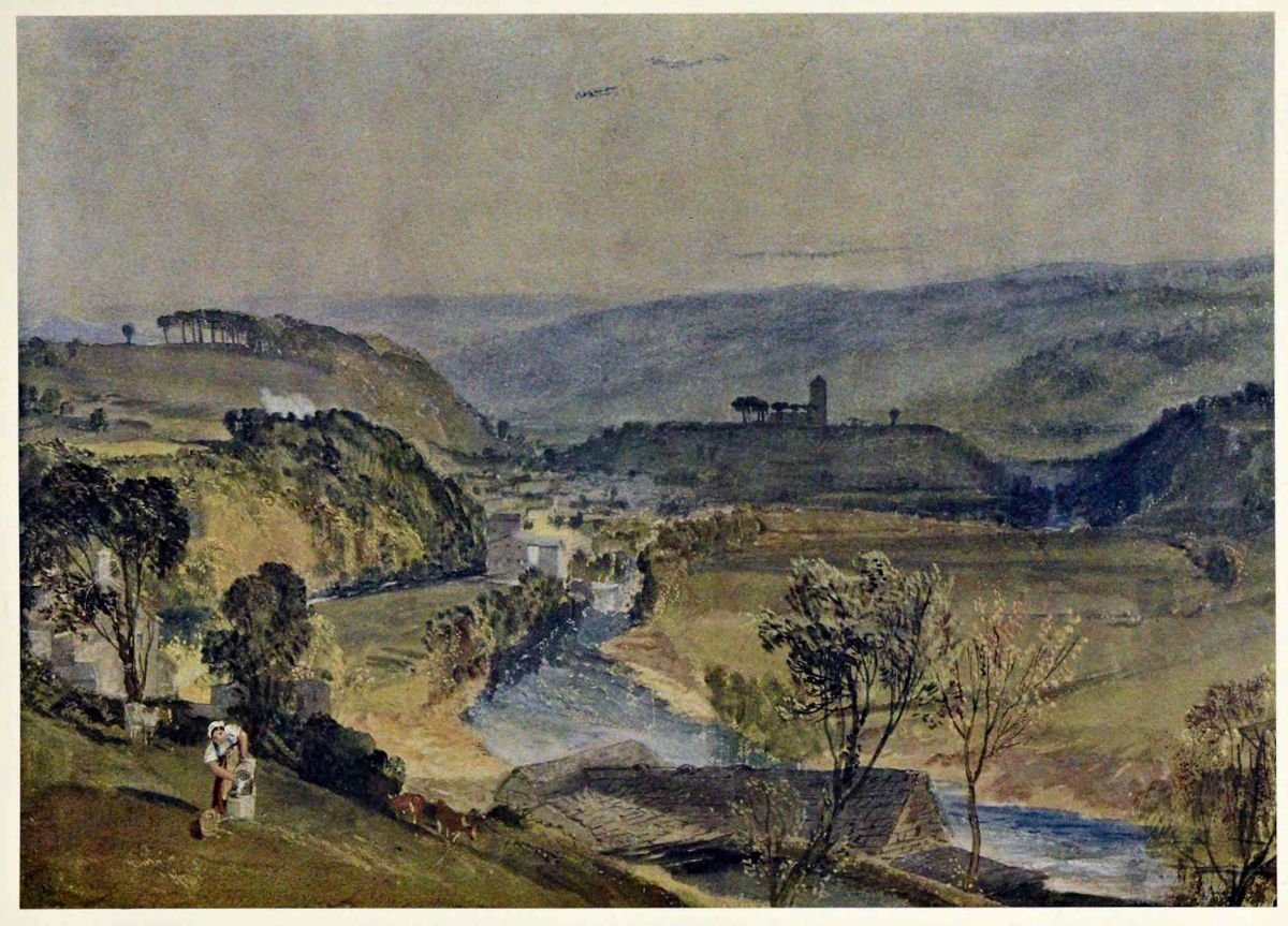 The water-colours Turner made from the sketches taken during this year are among the sunniest and happiest of his works. The lovely Hornby Castle from Tatham Church (now in the Victoria and Albert Museum), and the Crook of the Lune (in the Rev. W.{8} Macgregor’s collection) are perhaps the finest now existing of this series. But the happiness and pure enjoyment of life that breathe through these drawings must have been due to the artist’s memories and associations, rather than to his actual experiences of the places represented, for the weather seems to have been consistently bad during the whole of this summer and autumn. In the letter to Mr. Holworthy referred to above, Turner wrote that his present trip had been “a most confounded fagg.” Though he was on horseback, he added, “the passage out of Teesdale leaves everything far behind for difficulty—Bogged most compleatly, Horse and its Rider, and nine hours making 11 miles.” And in another part of the same letter, he wrote, “As to weather, there is nothing inviting, it must be confessed. Rain, rain, rain, day after day. Italy deluged, Switzerland a wash-pot, Neufchatel, Berne and Morat Lakes all in one—all chance of getting over the Simplon or any of the passes now vanished like the morning mist.” So the writer had evidently nursed some project of going to Italy in the latter part of this year, a project which he was not able to carry out till two years later.