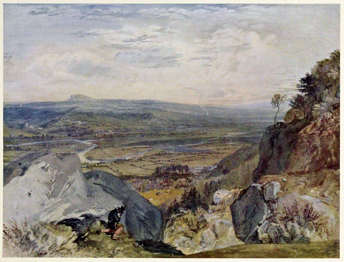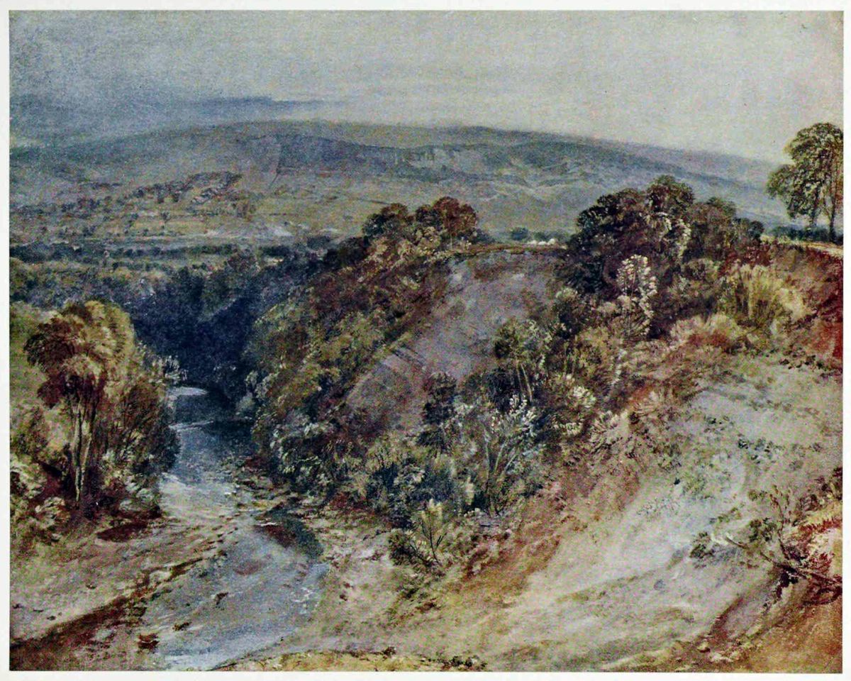 This drawing is executed in body-colour on brown paper. The River Washburne, with water-mill, is seen in the foreground, Leathley Church on the hill in the middle-distance, and the Otley Chevin, with Caley Park, beyond. The steep wooded bank on the right of the river in the middle-distance is the scene of the drawing The Banks of the Washburne (Plate XI). The drawing of The Valley of the Washburne, and Lindley Bridge (Plate XIX) was made from a spot near the mill in the foreground, looking towards the right.