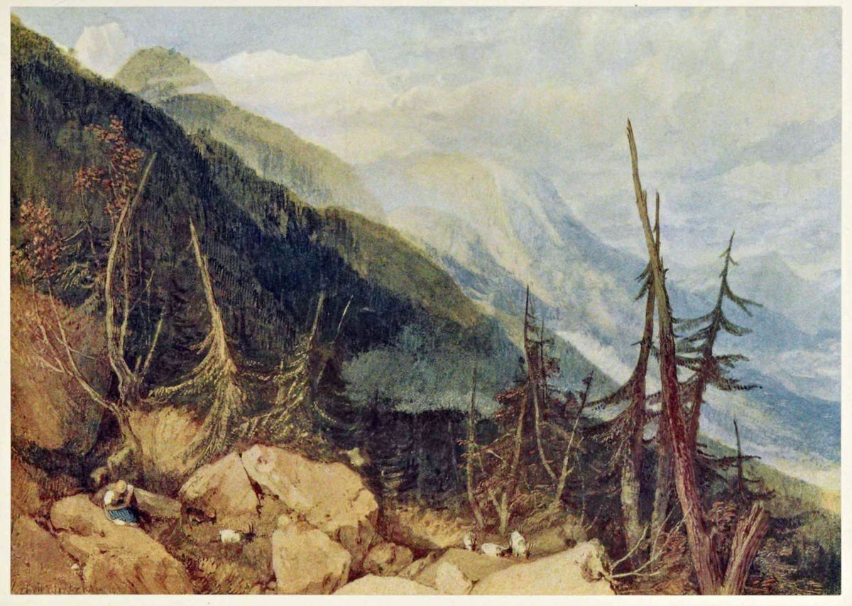 The pencil-sketch of this view, made in Switzerland in 1802, is in the National Gallery (LXXVII, p. 34). It has an “F” written in ink in the corner, evidently put there when Mr. Fawkes ordered this drawing. There is also a colour-study in the same collection (LXXX, E.). The blue has slightly faded in this drawing, but the general effect remains harmonious and very impressive.