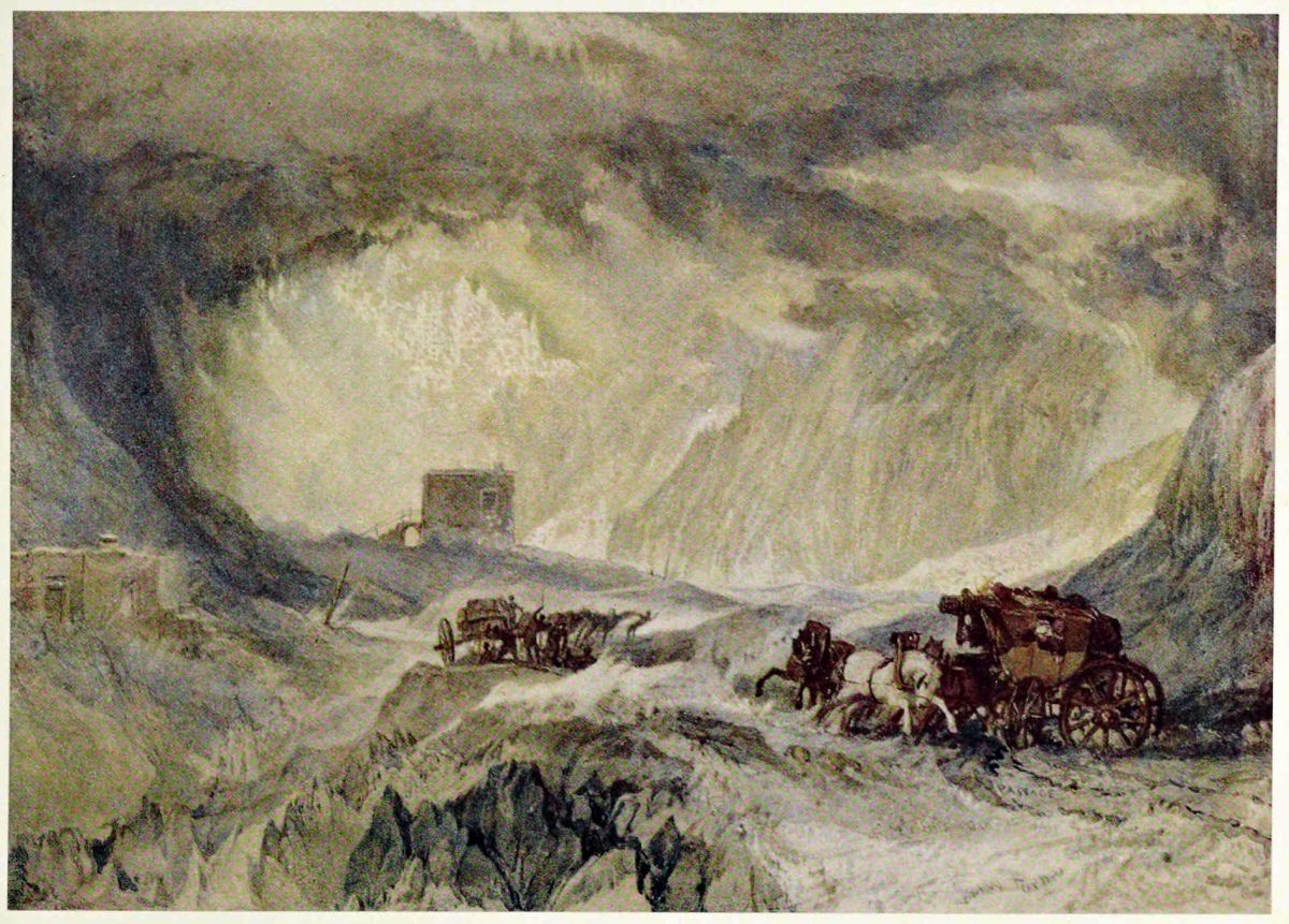 It was probably in London that Mr. Fawkes first met Turner, and the two men had very likely known each other for some time before Turner was induced to pay a visit to his friend’s home in Yorkshire. The first clear piece of evidence of Turner being at Farnley is in connection with Mr. Hawksworth Fawkes’s story of the origin of Turner’s large oil painting (now in the National Gallery) of Hannibal crossing the Alps. This picture was exhibited at the Royal Academy{3} in 1812, so the incident described in the following words by Mr. Hawksworth Fawkes—he was a boy at the time—must have taken place in 1810 or 1811: “One stormy day at Farnley Turner called to me loudly from the doorway, ‘Hawkey! Hawkey! come here! come here! look at this thunderstorm. Isn’t it grand?—isn’t it wonderful?—isn’t it sublime?’ All this time he was making notes of its form and colour on the back of a letter. I proposed some better drawing-block, but he said it did very well. He was absorbed; he was entranced. There was the storm rolling and sweeping and shafting out its lightning over the Yorkshire hills. Presently the storm passed, and he finished.