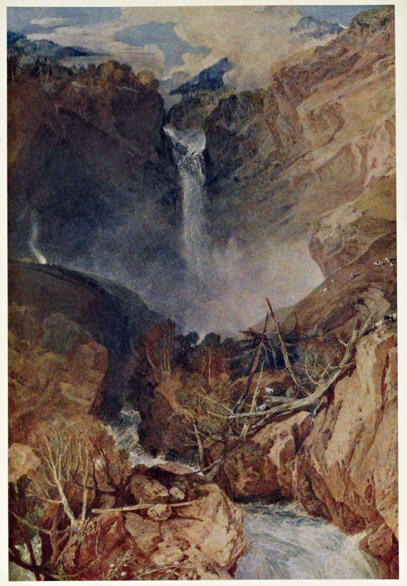 The earliest of Turner’s works in the Farnley Hall Collection is that of The Mer de Glace, Chamounix. This is probably the drawing exhibited at the Royal Academy in 1803, under the title “Glacier and Source of the Arveron going up to the Mer de Glace, in the Valley of Chamouni.” Mr. Fawkes may have seen the drawing in the exhibition and bought it there or afterwards in the artist’s studio. In a small pocket-book of Turner, apparently in use about the year 1804, there is a note that Mr. Fawkes had bought three water-colours for fifty guineas each. These are described by the artist as Great Devil’s Bridge Causeway, Upper Fall of Riquenbach and Mt. Blanc from St. Martin. The first two subjects are still at Farnley, the third is probably the Mt. Blanc from the Val d’Aosta which passed from the Farnley Collection before the present owner came into possession. It was lent by Sir Donald Currie to the exhibition of “Old Masters” at the Royal Academy in 1906.