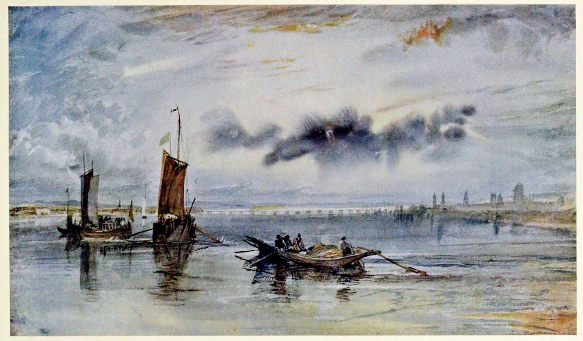The earliest oil painting of Turner’s that Mr. Fawkes bought was the beautiful sea-piece sometimes called The Pilot Boat, and sometimes Red Cap. This was exhibited, in the “one-man show” Turner held in his studio in 1809, under the title Shoeburyness Fishermen hailing a Whitstable Hoy. There is a pen-and-ink sketch of this picture inside the cover of the “Greenwich Sketch-Book” (cII, Turner Bequest), and on the fly-leaf appears the following record of drawings made, or to be made, for Mr. Fawkes:—
