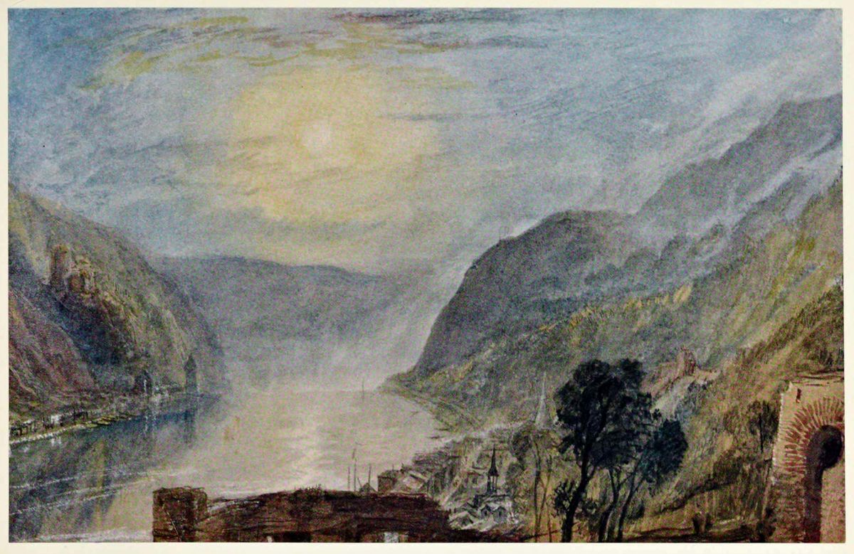 The year 1817 saw the addition of a very important series of fifty drawings to Mr. Walter Fawkes’s already large collection. These were the famous Rhine drawings. The date of their execution is given incorrectly in Thornbury, but the newly-discovered evidence of the sketch-books and an entry in Mrs. Fawkes’s diary enable us to correct Thornbury’s inaccuracies. Thornbury says these drawings “were done at the prodigious rate of three a day,” and in support of this statement he adds that Turner was away only for a fortnight, and that “after landing at Hull he came straight to Farnley, where, even before taking off his great-coat, he produced the drawings, in a slovenly roll from his breast pocket; and Mr. Fawkes bought the lot for some £500, doubtless to Turner’s delight, for he could not bear that any series of his should be broken.” But a kind of rough diary of Turner’s movements in the “Itinerary Rhine Tour Sketch-Book” (CLIX, Turner Bequest) says that the artist “left London” on Sunday, 10th August, was “off Margate” on Monday, 11th, and reached Brussels Thursday evening, on the 14th. He spent Saturday, visiting the Field of Waterloo, and, taking the diligence on Sunday, passed through Liège and Aix-la-Chapelle, reaching Cologne on the 18th. On Tuesday he walked to Bonn, and on the following day to Remagen. He was at Coblenz on Thursday and Friday, the 21st and 22nd, at St. Goar on the next two days, and at Mayence on the 25th and 26th. He returned to St. Goar on the 27th, and, passing through Coblenz on the 28th, he reached Cologne on the 29th, and left it the next day, returning through Aix and Liège. He was at Antwerp on the 2nd and 3rd of September, and at Rotterdam on the 4th and 5th, from whence he made his way to The Hague and Amsterdam. The notes against the dates to the 15th September are too elliptical and undecipherable to convey any information, but even if the artist did take the boat from Holland to Hull (the most probable route of his return) immediately on or after this date, it is clear that he did not go straight{9} from there to Farnley. He had some work to do in Durham before he could go there—sketches to make of Gibside and Hylton Castle, the seats of the Earl of Strathmore, and of Raby Castle, the seat of the Earl of Darlington, to illustrate Surtees’ “History of the County of Durham.” He had also a commission to paint a large oil picture of the latter castle for its owner, a picture which duly appeared on the walls of the Royal Academy in the following year. A passage in a letter to Mr. Holworthy, written on the 21st November, 1817, says that “Lord Strathmore call’d at Raby and took me away to the North,” thus keeping him in Durham longer than he had expected. In this way Turner did not reach Farnley till the middle of November. Mrs. Fawkes’s diary tells us that she and her husband “went to Thorp Ash” on Thursday, 13th November, and on the 15th the entry runs, “Heavy rain. Returned home. Found Mr. Turner and Greaves here.” It is evident that Turner stayed there for about a week, as the letter of the 21st November is dated from Farnley Hall, but it is probable that he did not remain much longer, as he was clearly anxious to get back home and to work, for he says in this letter, “The season is far spent, the night of winter near at hand, and Barry’s words are always ringing in my ears—‘Get home and light your lamp.’