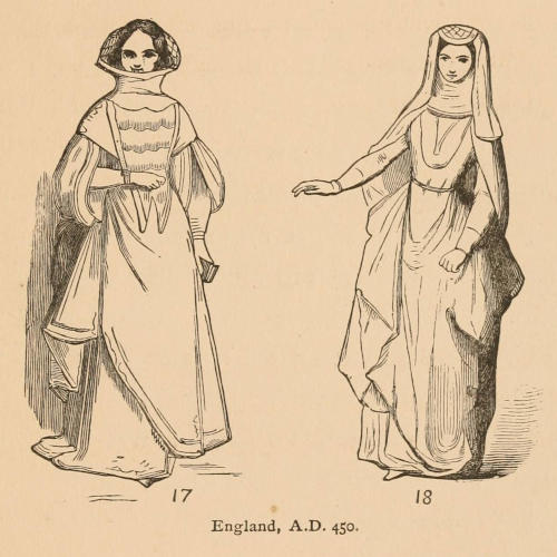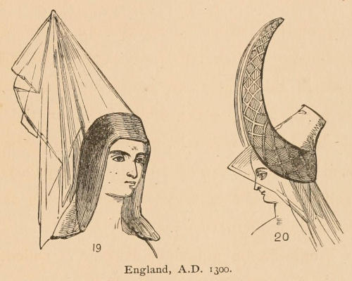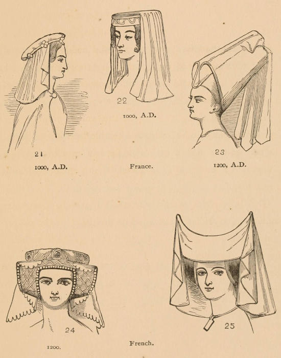 In ancient Britain, from the earliest time to the arrival of the Saxons, A.D. 450, we can find no mention made of ladies’ head-dress, and but little is mentioned until about 1066, and even at this date not any style existed, although[22] Anglo-Saxon females of all ranks wore a veil, or long piece of linen or silk wrapped around the head and neck. This part of their dress was exceedingly unbecoming, perhaps partly owing to the want of skill in the artists, and this head-dress was seldom worn except when they went from home (see figures on preceding page), as the hair itself was cherished and ornamented with as much attention as in modern times.
