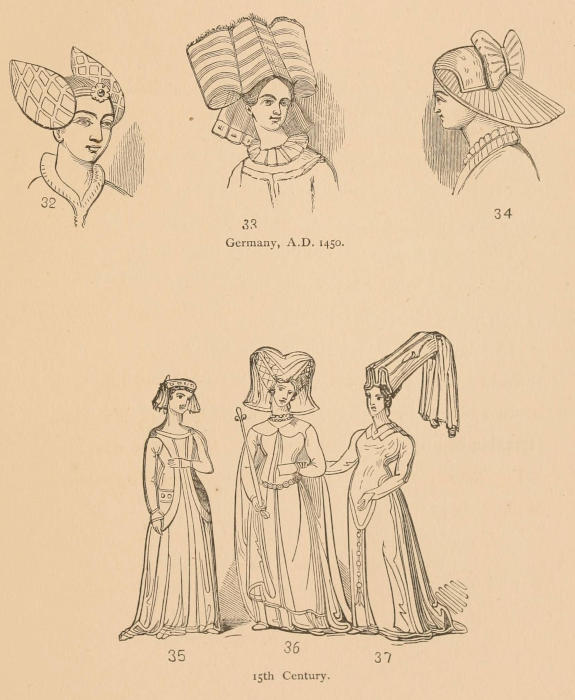 In France, during the reign of Charles VIII., in 1483, it is recorded that head-dresses were lowered considerably; but in the portrait of Mary of Burgundy, we find that she still wore the favorite towering cap that had been fashionable for two hundred years before her time, with the veil hanging to the ground and a square piece lying upon the neck and shoulders.