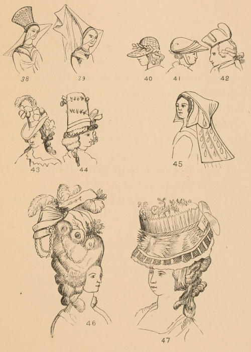 The head-dress of the women, as well as their costumes, were different at different periods, as figures on preceding page illustrate.
