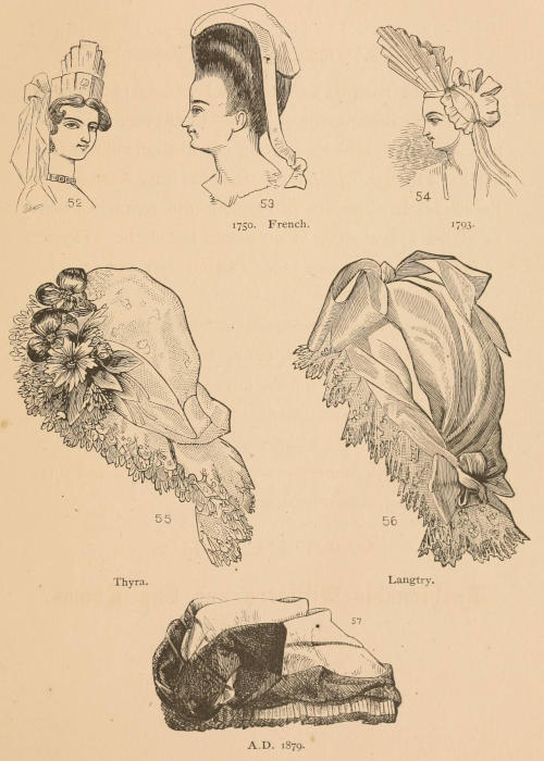 As yet no mention has been made of caps, but a great many of the illustrations of simple head-covering resemble caps more than hats or bonnets, although not so designated. Figs. 52, 53, and 54 are dress caps worn by the French in the sixteenth and seventeenth centuries. Fig. 55 shows a new style of dress cap called the “Thyra,” composed of Bretonne lace, ribbon, and flowers; the crown being of dotted lace.