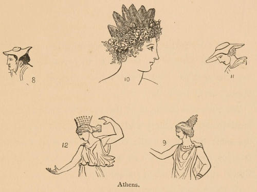 On journeys, women wore a light, broad-brimmed petasos, which Figs. 8 and 11 represent, as a protection from the sun. At a late period the head-dress of Athenian ladies, at home and for the street, consisted, in addition to the customary veil, chiefly of different contrivances for holding together their plentiful hair.