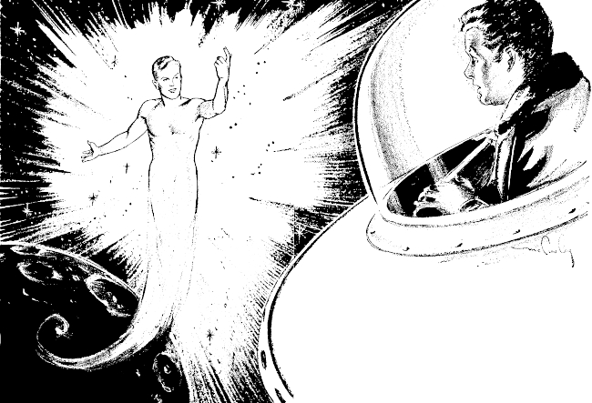 As he looked through the glassite hull of the space ship at the surface of the Moon a strange thing happened. A shimmering figure appeared in a halo of light.