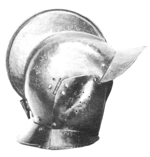 A fourth and final type of helmet was known as a “pikeman’s pot.” This greatly resembled the morion, but had a broad flat brim instead of a narrow crescentic one. As its name indicates, it was worn primarily by pikemen in conjunction with a specific type of corselet which was generally designated pikeman’s armor.