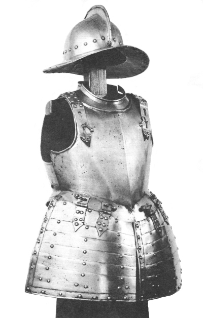Men armed with muskets might sometimes wear pikeman’s armor, but more often they wore simpler corselets consisting only of breast and back-plates. With these corselets they wore either a cabasset, a morion or a burgonet.