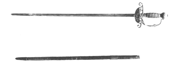 Fortunately, one of the cup-hilted rapiers used by the Pilgrims has survived. It belonged to Captain Miles Standish, the doughty military advisor of the colony, and it is now preserved in Pilgrim Hall. It is a very good example of the Dutch-English style of cup hilt, the shallow iron cup and supplementary branches, the knuckle-bow, and the pommel are decorated with crudely incised designs of leaves and masks. The grips are covered with black leather. Originally they were wound with twisted wire in the spiral grooves, but the wire is now missing. The scabbard also has been preserved, and that is most unusual for swords of this period. It is made of wood, almost cylindrical, covered with black leather. There is an iron ferrule at the throat (which has [Pg 9] now slipped several inches down the scabbard) and an iron tip. Interestingly, Standish is known to have been a short man whose enemies sometimes called him “Captain Shrimp,” and this sword is about six inches shorter than the average rapier, which would have made it easier to handle for a small man.