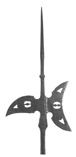 In addition to these edged weapons which were worn on the belt, there were also weapons with long wooden hafts, known as pole arms. Of these, two forms were principally used at Plymouth, the pike and the halberd. The pike was a spear with a simple leaf-shaped head attached by long straps to a wooden pole some fourteen feet long. The halberd was a combination of axe and spear, and its haft was much shorter, perhaps six or seven feet, exclusive of the head.