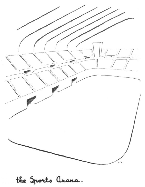 The Coliseum is a remarkable structure. Mr. Strauss has stated that a great many architectural problems had to be solved in planning the edifice. The necessarily massive size and isolated location might have resulted in an ill-proportioned and bulky building. Fortunately, the judicious adaptation of a contemporary modern style by the architects has achieved a dignified building that is both functional and beautiful. By placing the ramps between the levels on the exterior, Mr. Strauss succeeded in overcoming bulky appearance. The ramps modify a bluff façade of high vertical walls and soften the relationship between the bulk of the mass and the adjacent ground area.