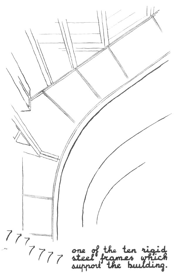 One problem in the construction of a great building arises from discrepancies in the rates of expansion and contraction of various materials used. In the Coliseum the concrete seating construction is attached to the steel frame of the building by a device operating on the principle of a hinge. It is so designed that when the steel and concrete expand at different coefficients, the hinge moves to adjust to the disparity. Careful consideration has been given to facilitating the ingress and egress of spectators. The upper main seating area is served by sixteen vomitory entrances, and the lower arena by four. The multiple entrances make it possible to empty the building very rapidly after each performance and are an important safety factor in case of emergency.