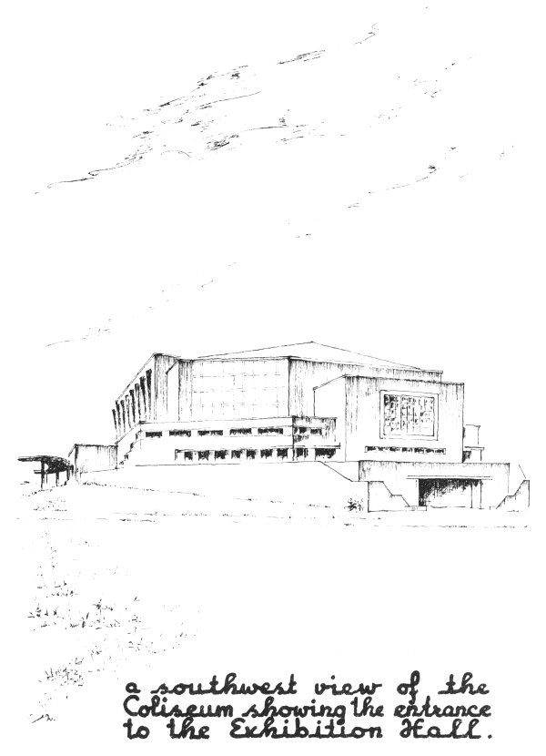 a southwest view of the Coliseum showing the entrance to the Exhibition Hall.