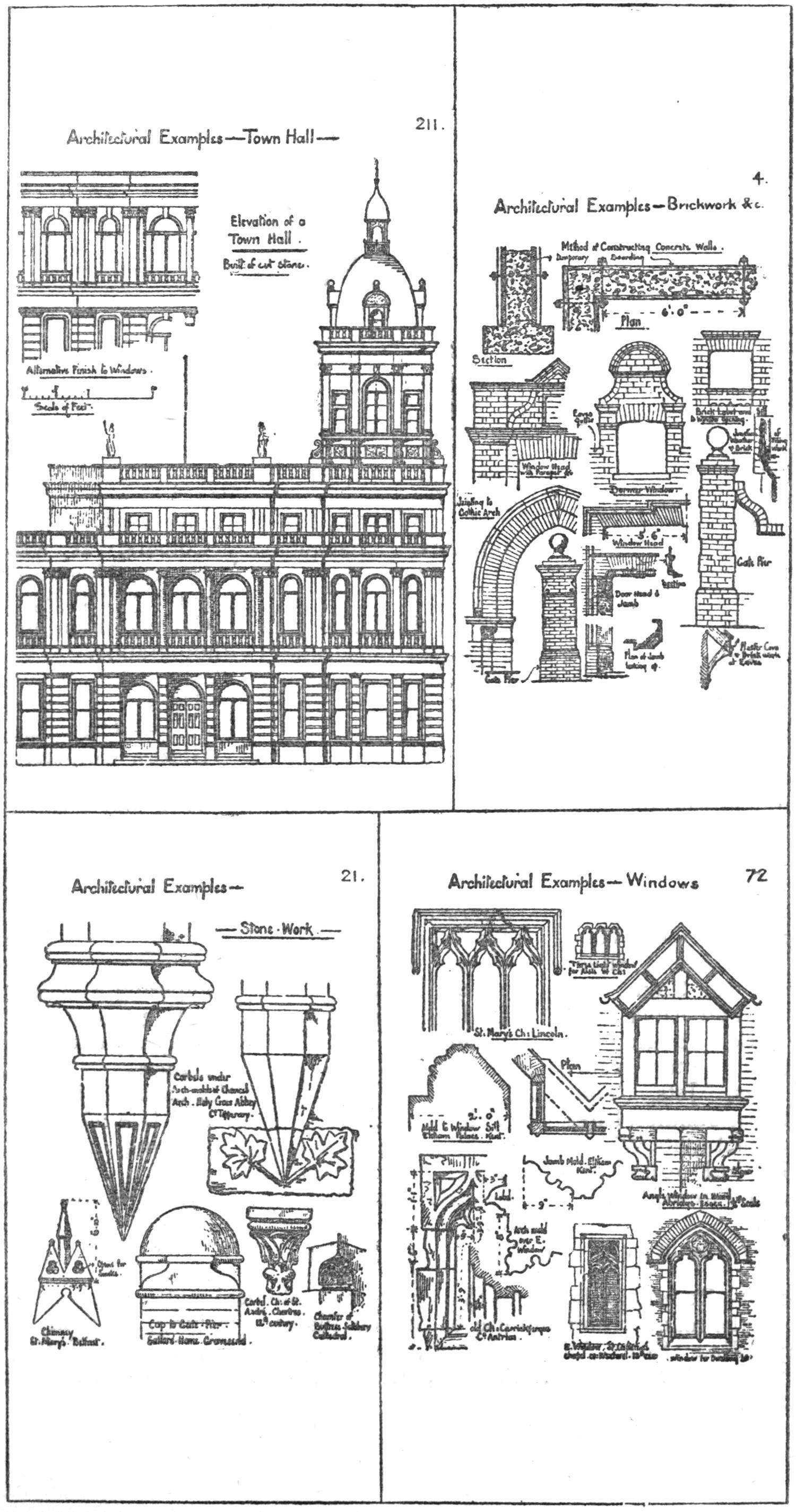 The Plates are arranged in Two Parts. The First Part contains Details of Work in the four principal Building materials, the following being a few of the subjects in this Part:—Various forms of Doors and Windows, Wood and Iron Roofs, Half Timber Work, Porches, Towers, Spires, Belfries, Flying Buttresses, Groining, Carving, Church Fittings, Constructive and Ornamental Iron Work, Classic and Gothic Molds and Ornament, Foliation Natural and Conventional, Stained Glass, Coloured Decoration, a Section to Scale of the Great Pyramid, Grecian and Roman Work, Continental and English Gothic, Pile Foundations, Chimney Shafts according to the regulations of the London County Council, Board Schools. The Second Part consists of Drawings of Plans and Elevations of Buildings, arranged under the following heads:—Workmen’s Cottages and Dwellings, Cottage Residences and Dwelling Houses, Shops, Factories, Warehouses, Schools, Churches and Chapels, Public Buildings, Hotels and Taverns, and Buildings of a general character.