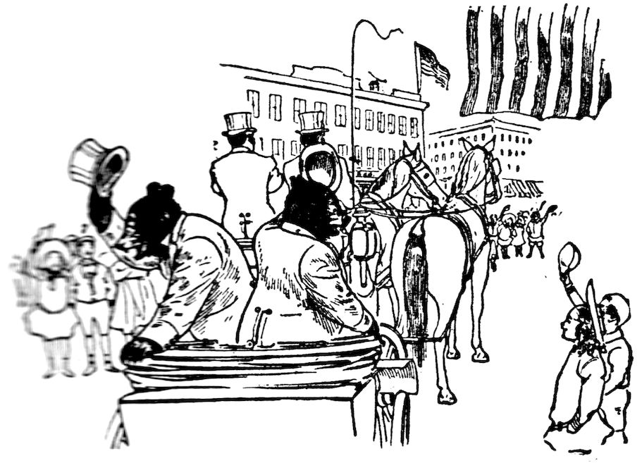 Then to Niagara Falls to view the wonders of nature at that place, and next to Boston, where they meet with a rousing reception and are entertained at the home of Miss Priscilla Alden and her brother Will. While in Boston they visit all the places of historical interest, such as Bunker Hill, Plymouth Rock, Concord and Lexington. They have an exciting scorch in an automobile, which causes their arrest and an uncomfortable night in the Boston Jail. They receive honorary degrees at Harvard University, and afterwards take a canoe trip down Boston Bay and are swept out to sea by a storm and land on an iceberg, where they meet a polar bear who has just come down from the northern seas on his floating ship of ice. They are rescued from this place by a passing steamer and carried to New York City, in which place they immediately advertise for a guide to assist them in seeing the town.