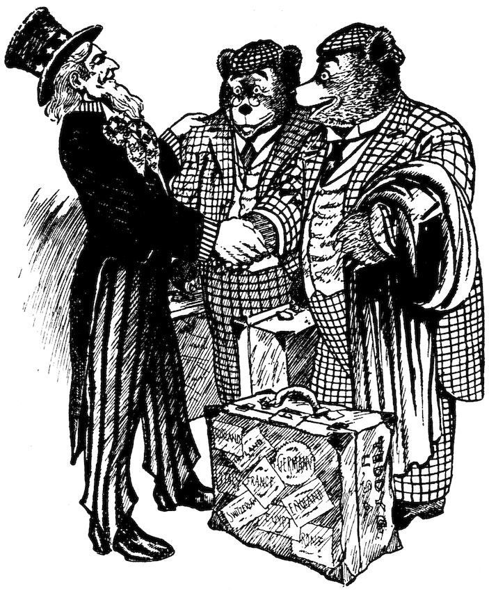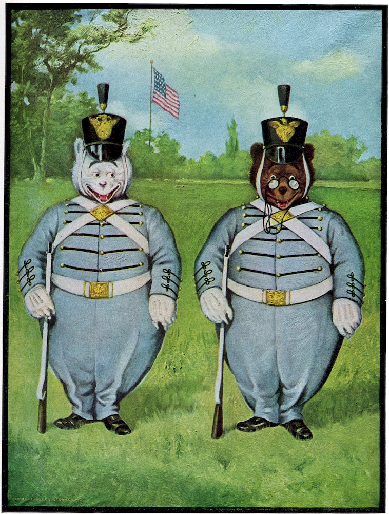Feeling that their foreign tour would not be complete without a visit to Egypt, they take a trip up the Nile and see the Pyramids and the Sphinx, after which they start back for America, and are greeted upon landing at the steamer pier in New York City by that famous gentleman known throughout the world as “Uncle Sam.” This will undoubtedly be one of the most interesting books of the Roosevelt Bears series.