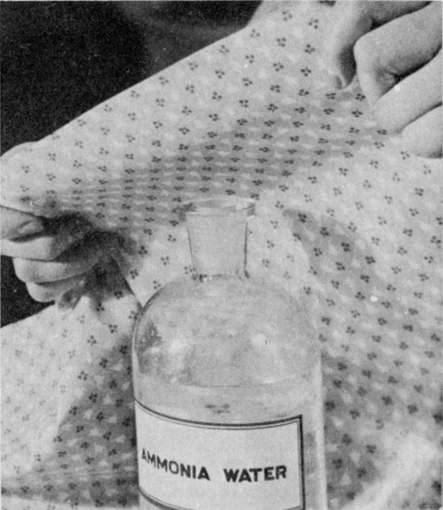 Ammonia water.—Hold the dampened stain over an open bottle of strong ammonia water; or if the material doesn’t water-spot, put a few drops of ammonia water, diluted to half strength on the stain. Since ammonia water affects some dyes, have white vinegar ready to apply quickly if the color changes. Rinse well with water.