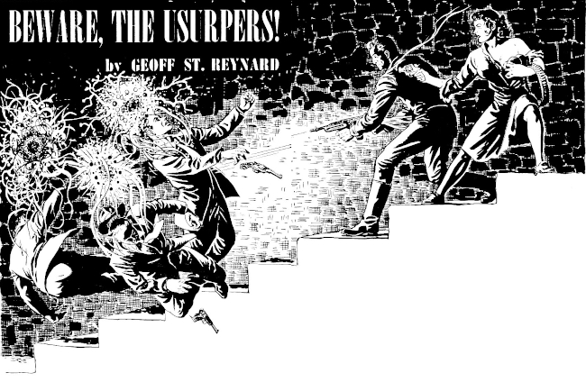 He clumped up the steps, and his bull's roar quelled the racket like thunder drowning out a kindergarten choir. The thugs turned astonished eyes upward, and the few usurpers still on their feet shrank together in a corner. For one brief instant I felt pity for them. Then I remembered their plot to take over our world....
