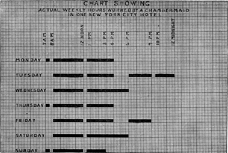 The other workers in the pantry and kitchen of one of these hotels worked broken shifts. The workers had rotating shifts with a long day and then a short day. On the day before the weekly day off, each worker worked a 12 or 13-hour day. The irregularity of a pantry worker’s hours and the distribution over a seven-day period, is shown on the chart on the following page. The length of working hours for the worker in this instance ranged from 6 to 13 hours daily. On days on which the long shift was worked, the hours were distributed over a period of 18 hours. The total weekly hours of this pantry worker were 63. The two other pantry workers in this hotel worked a 56-hour week and a 60-hour week, respectively. Since a girl always worked a long day of 12 to 13 hours before her free day, she was unable to derive full benefit from it because of fatigue.