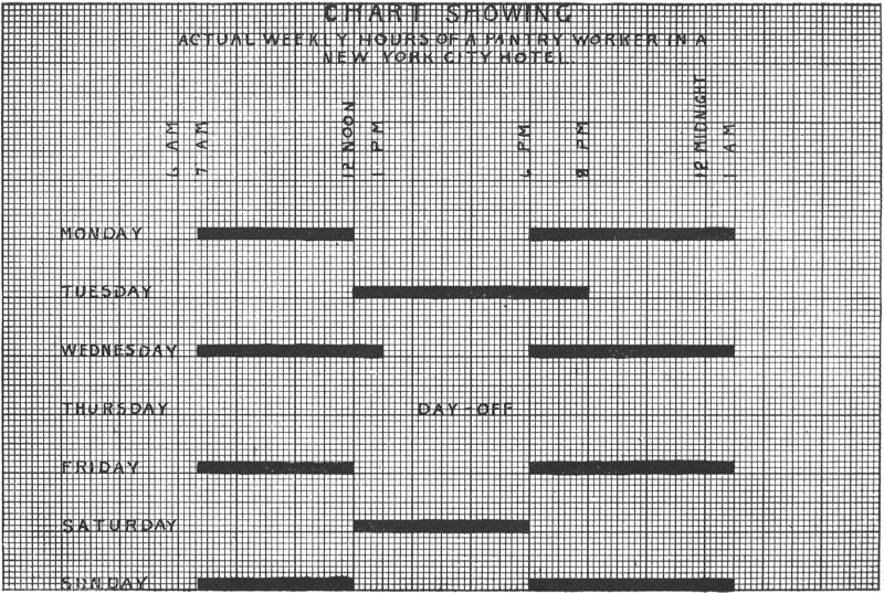 Broken shifts distributed over a long period of time with scheduled hours of work changing from day to day are a great hardship to the woman worker. Aside from the fact that two hours in the middle of the afternoon are useless to a woman if she must dress and take a car to go home, and take a car to return and dress again on reaching the hotel, broken shifts mean that meals and sleep must be snatched at irregular intervals. Such a hit or miss existence, with no regular hours for work, rest and recreation, does not make for the physical well-being of the worker.