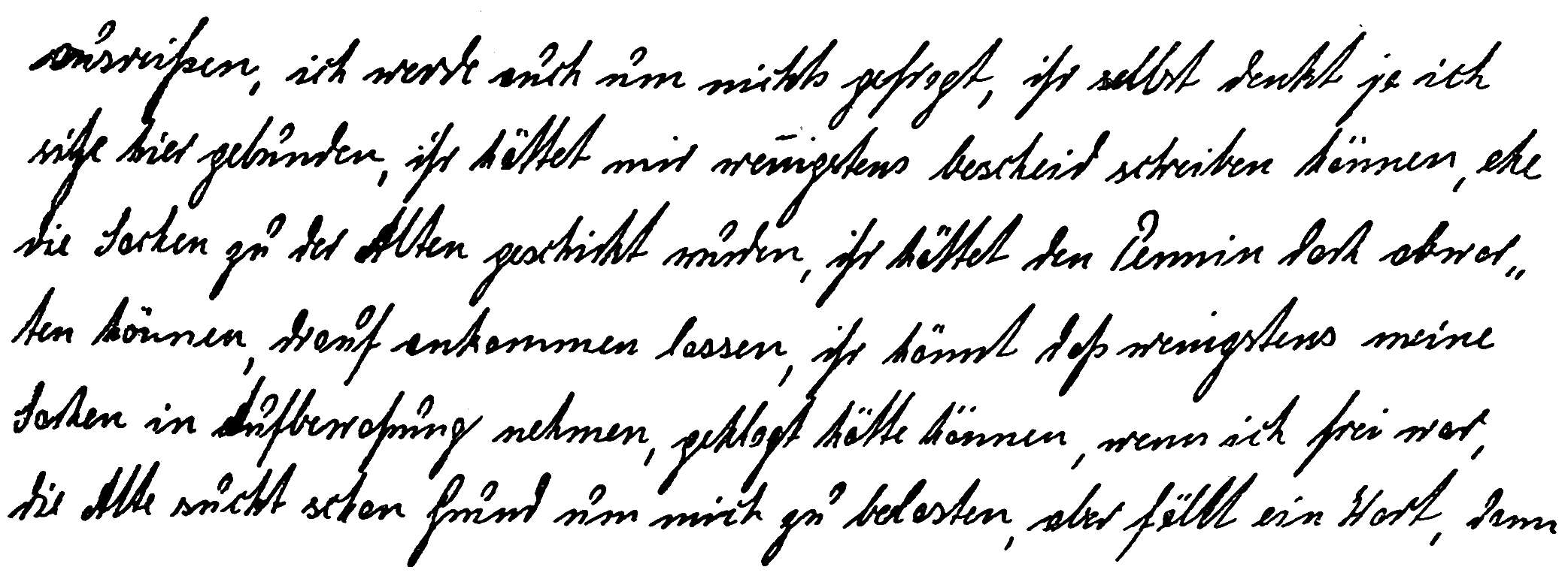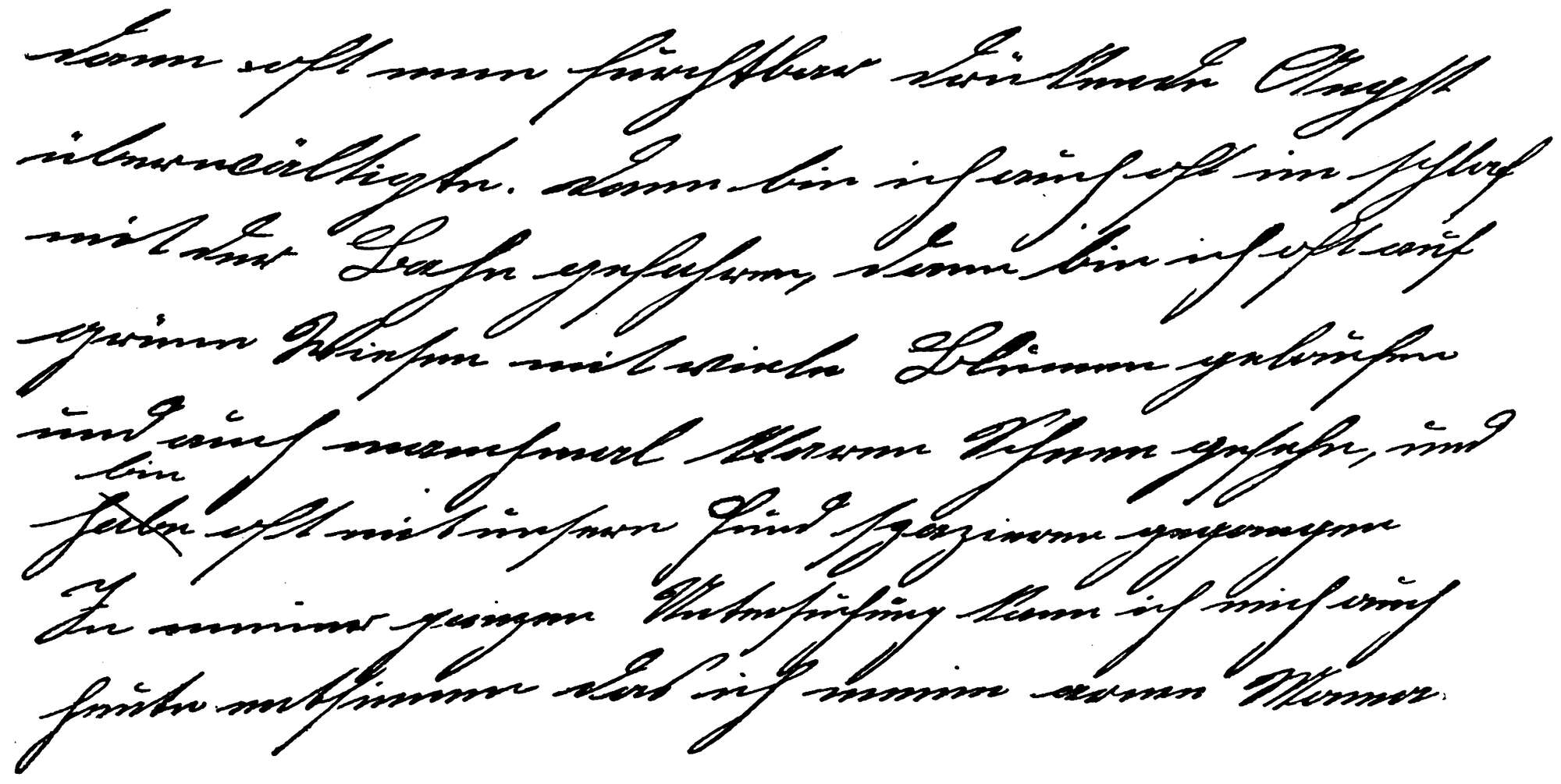 Ein verschlossenes Wesen (siehe die Arkadenbildung bei der Bindung der Buchstaben „n“ und „m“ in „ich“, „auch“ Zeile 1, das Zuriegeln der Vokale a und o, der abwärts gedrehte U-Bogen). Die Schriftlage von mäßiger Linksschräge bis zum Steilen zeigt das schwache Gefühl an, Vorwiegen des Verstandes, die innere Kühle. Dabei Triebhaftigkeit, Hingabe an den Eindruck, Neigung zum Genuß ohne seelische Zentrierung (die geringe Schärfe der Schrift, ihre Teigigkeit). – Im wesentlichen Kühle, Nüchternheit, Verschlossenheit, dahinter ungeregelte Triebhaftigkeit, Entflammbarkeit, alles gedeckt durch kleinbürgerliche Haltung. –