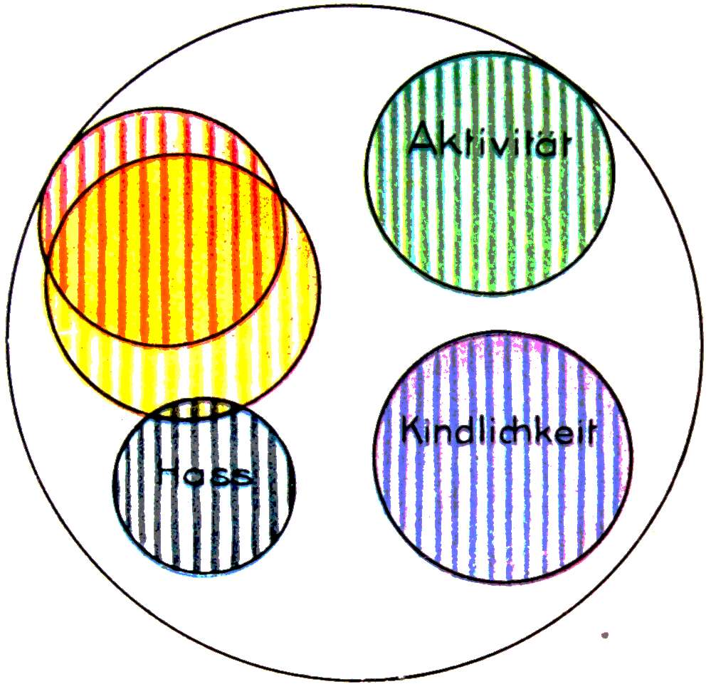 | 1. | Trüber, ungeformter, richtungsloser Gefühlsüberschwang, nicht abgesättigt. |