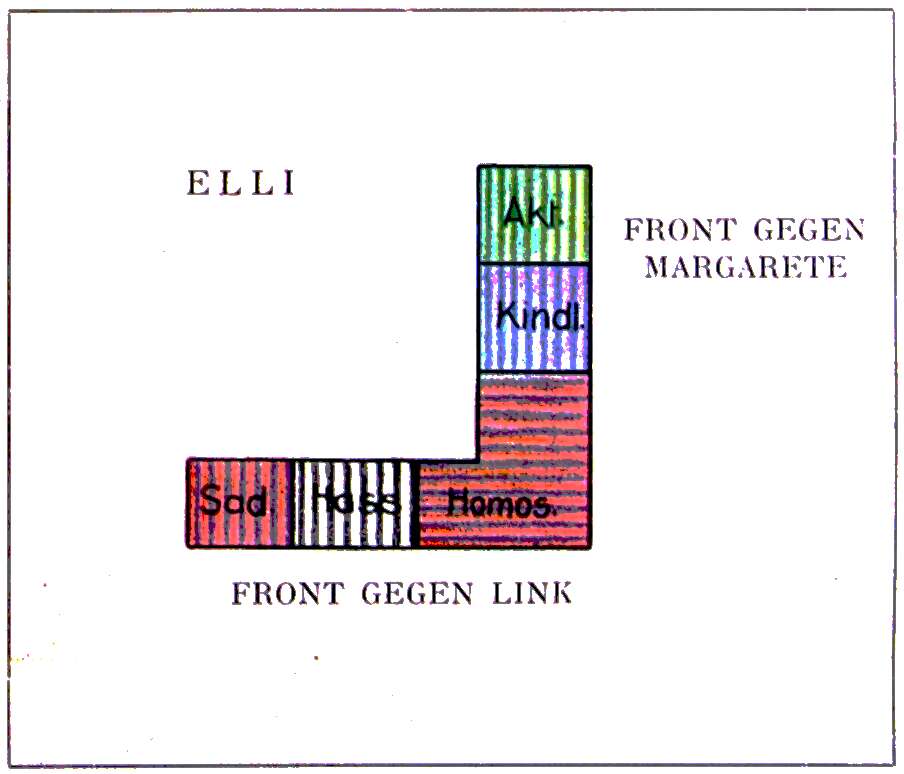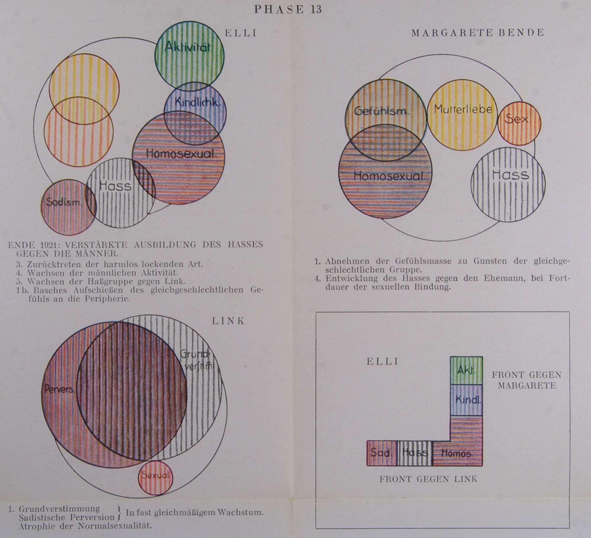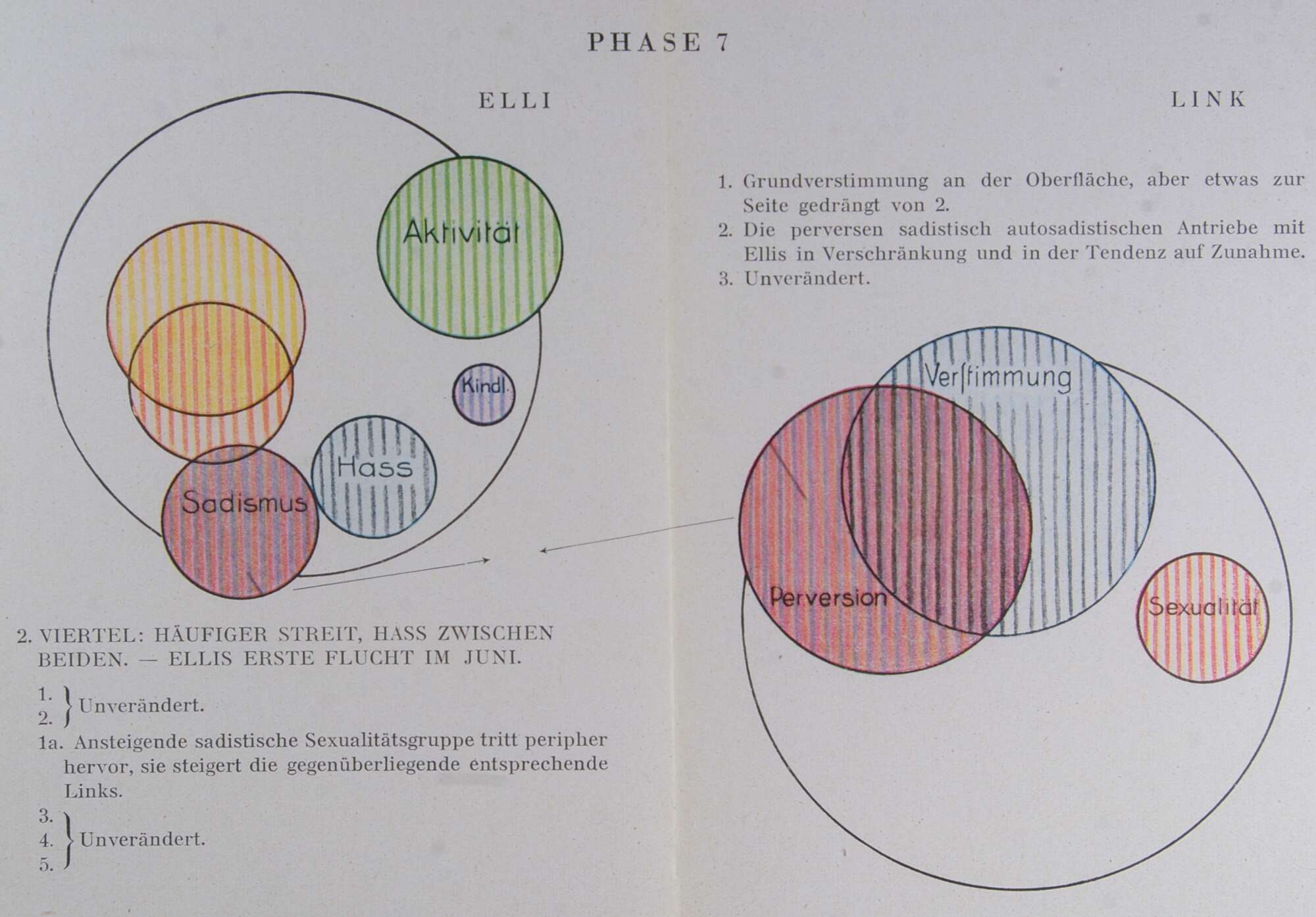 In der Hauptsache: mächtige Verstärkung und Vordringen des einfachen Haßtriebes, beginnende Faszination, während der sadistische Haß (1a) den Gegner festhält. Mäßiges Weiterwachsen des gleichgeschlechtlichen Gefühls.