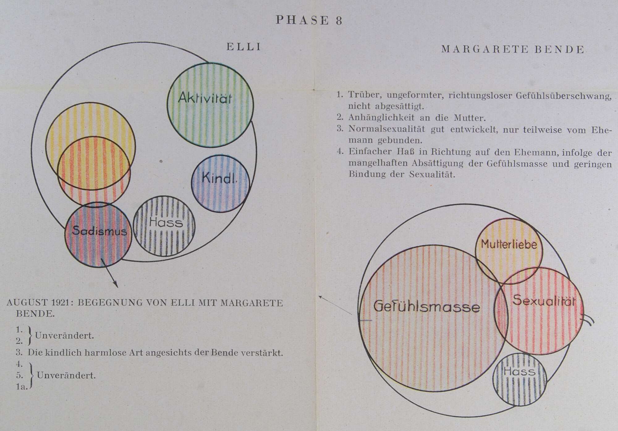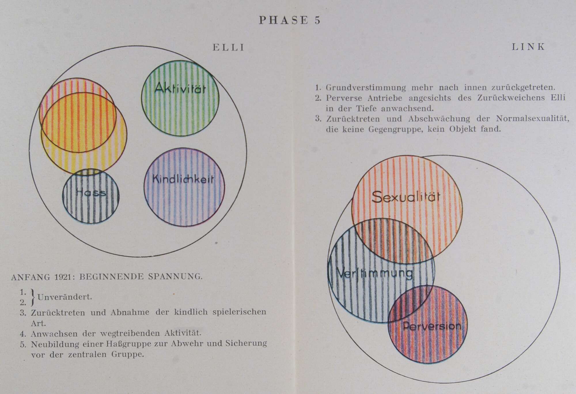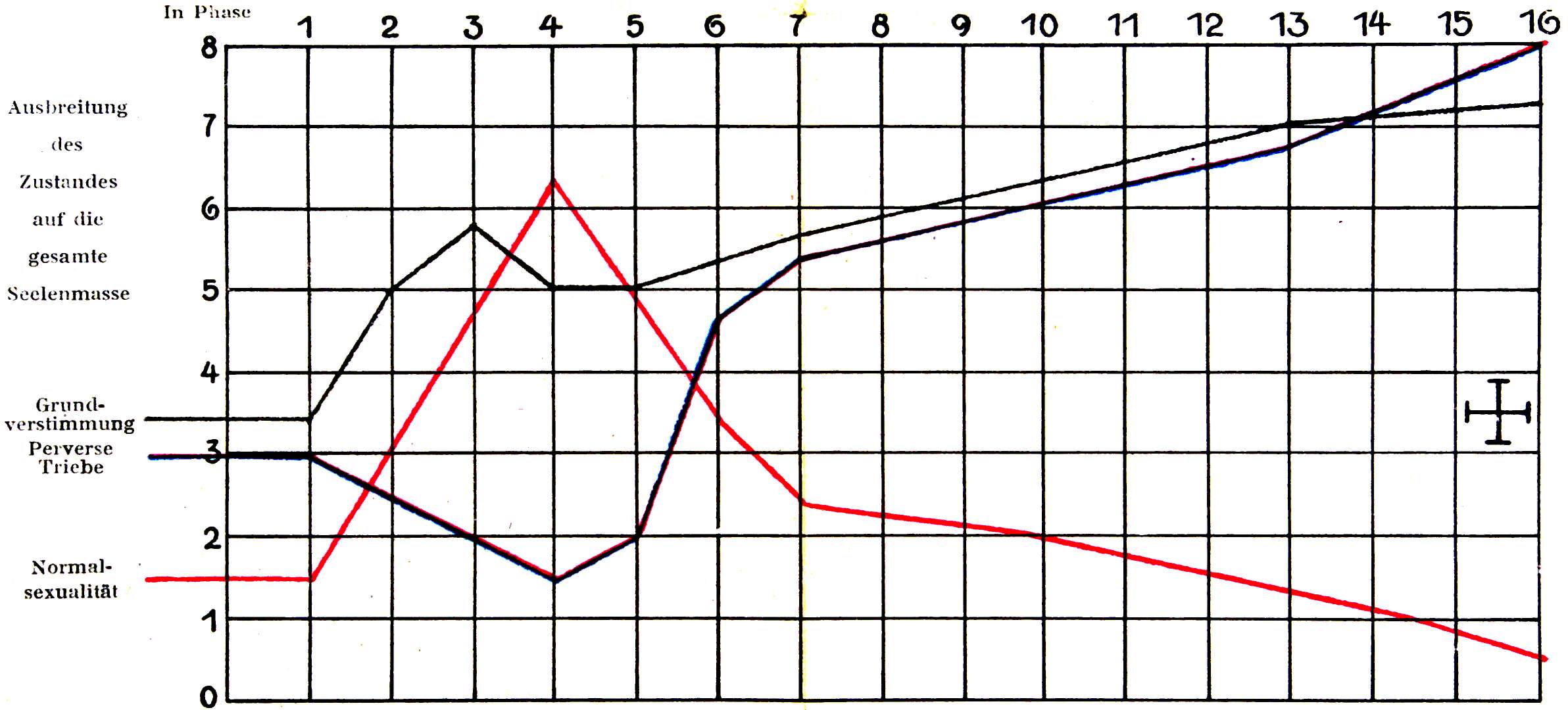 In der Hauptsache: mächtige Verstärkung und Vordringen des einfachen Haßtriebes, beginnende Faszination, während der sadistische Haß (1a) den Gegner festhält. Mäßiges Weiterwachsen des gleichgeschlechtlichen Gefühls.